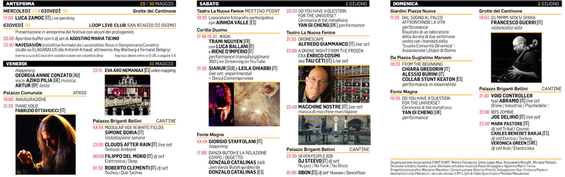 Dal parco di Fonte Magna al Teatro La Nuova Fenice, dalle grotte al Duomo passando per il Palazzo Comunale, tra le mura vivrà lo spettacolo di un vasto e immaginifico teatro a cielo aperto, all’insegna della commistione delle arti e della ricerca di contatto con il tessuto urbano e con chi lo abita, nella convinzione che conoscere sia, innanzitutto, costruire comunità. Ricca, composita e d’alto profilo l’offerta culturale: dalle arti visive al video, la performance, le installazioni site specific, i concerti ed i dj set. Di grande prestigio gli appuntamenti musicali: l’evento inaugurale con Fabrizio Ottaviucci uno dei più raffinati interpreti pianistici di Maestri del Novecento come John Cage, Terry Riley e Giacinto Scelsi, la presentazione del nuovo disco del violoncellista Francesco Guerri e il live di Enrico Cosimi autentico guru dell’elettronica italiana.