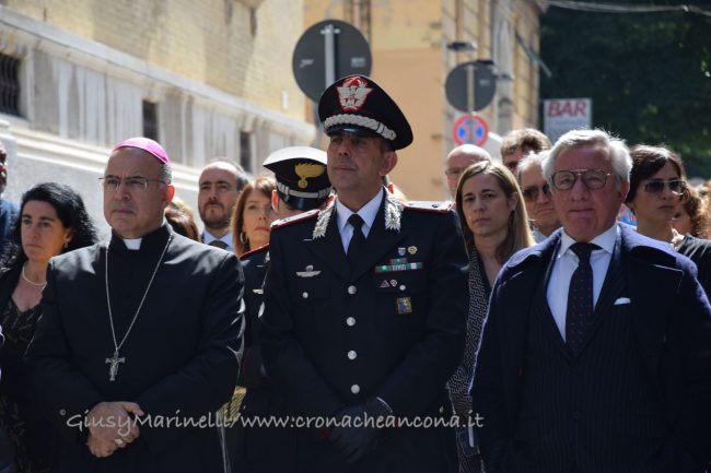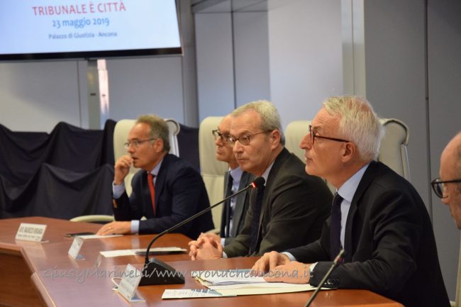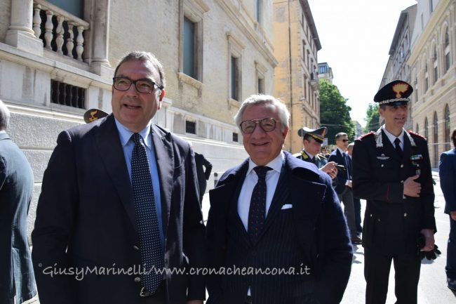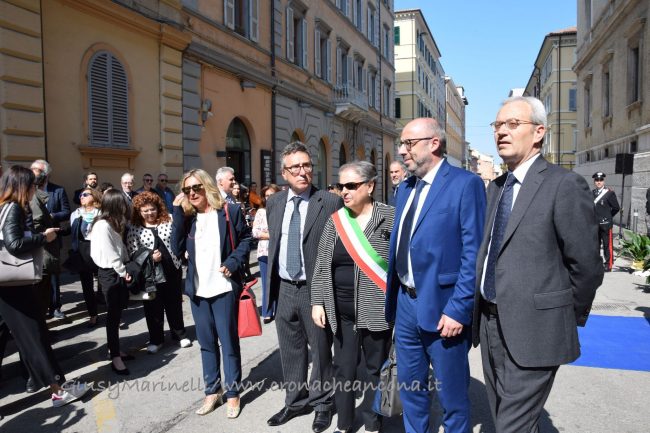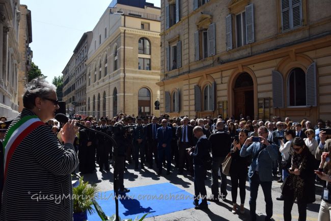 Il 23 maggio del 1992 morivano in un attentato il giudice Giovanni Falcone e la moglie Francesca Morvillo assieme alla loro scorta. A ventisette anni dalla strage il tribunale di Ancona ha voluto rendere omaggio non solo al magistrato che più di tutti rappresenta la lotta alla mafia, ma a tutte quelle personalità che hanno fatto della loro vita un inno alla legalità. Con un cerimonia solenne alle presenze delle maggiori autorità civili, militari e religiose, questa mattina è stato intitolato il palazzo di giustizia e le aule al suo interno. Tra le mura dell’immobile di corso Mazzini risuonano 14 nomi. Sono quelli di Vittorio Salmoni, presidente della Corte d’Appello destituito durante le leggi razziali perchè ebreo e antifascista; di Giovanni Falcone e Paolo Borsellino (a loro è dedicata la corte interna del tribunale); di Elisa Comani, prima donna iscritta all’albo degli avvocati dorici; Arturo Vecchini, avvocato ed ex sindaco di Ancona; Fausto Angelucci, ex procuratore generale della Corte d’Appello di Ancona; Mario Amato, magistrato ucciso in un attentato il 23 giugno 1980; Guido Galli, accademico e magistrato freddato mentre stava andando a insegnare all’università; Rosario Livatino, magistrato assassinato dalla mafia; Emanuela Loi, poliziotta uccisa nella strage di via d’Amelio; Carlo Alberto Dalla Chiesa, generale trucidato da Cosa Nostra; Vittorio Petrelli, finanziere ucciso in servizio; Giorgio Ambrosoli, avvocato assassinato; Peppino Impastato, il giornalista siciliano simbolo della lotta contro la mafia. Il palazzo è stato intitolato all’ascolano Vittorio Salmoni, con una targa posta all’ingresso di corso Mazzini.