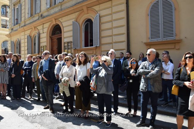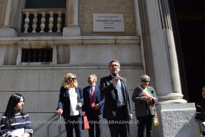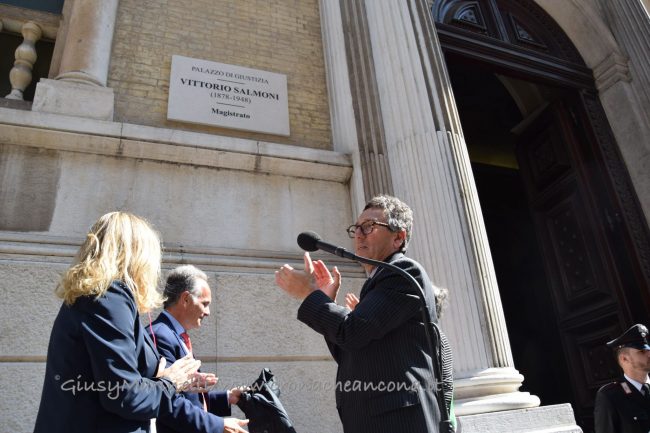 E’ stata scoperta dal sindaco Mancinelli, dal presidente del tribunale Spinosa, dal procuratore capo Garulli e dal presidente degli avvocati Miranda. Il primo cittadino: «Questa giornata – ha detto Mancinelli – vuol dire far riconciliare la città con un pezzo della sua storia e aprire il simbolo stesso dell’amministrazione della giustizia alla cittadinanza. L’intitolazione del tribunale significa che dobbiamo esercitare il dovere della memoria. Ringrazio la persona a cui intitoliamo il tribunale perchè seppe dare una lezione al mondo che è bene ricordare ogni giorno». Salmoni dovette abbandonare il tribunale con le leggi razziali per poi tornare in magistratura. Il presidente Spinosa: «Questa è una giornata dedicata al ricordo, lo dicono la data e i nomi a cui dedichiamo il palazzo e le aule. È anche una giornata di festa, perchè il palazzo si è rivestito con i suoi abiti migliori perchè vogliamo celebrare la giurisdizione di Ancona e rinnovare il matrimonio con la città». Le targhe con i nomi delle persone a cui sono dedicate le aule sono state scoperte al quinto piano del tribunale. Presenti alcuni familiari di coloro che non ci sono più, come il nipote di Salmoni, la figlia di Guido Galli, il figlio del giudice Amato e quello di Angelucci. Questa sera andrà in scena, nel corte del tribunale, lo spettacolo ‘Paragoghè’, dedicato ai depistaggi delle stragi che hanno segnato uno dei capitoli più bui della storia italiana. Il presidente della Corte d’Appello Luigi Catelli sui nomi che risuoneranno in tribunale: «Rappresentano la memoria che ci portiamo dentro e il ricordo di vite professionali spese per i principi della legalità e della costituzione. Il ricordo deve essere vivo e vissuto nel presente per essere trasmesso alle nuove generazioni». Il procuratore generale Sergio Sottani: «Dobbiamo insegnare e ricordare la storia e con questa intitolazione dobbiamo far sentire i morti meno soli e dirgli che noi vinceremo». Il procuratore capo Monica Garulli: «La grandezza delle persone che ricordiamo non è stata quella di essere degli eroi, ma adempiere ai loro compiti. Si tratta di persone che fino in fondo hanno adempiuto al loro dovere».