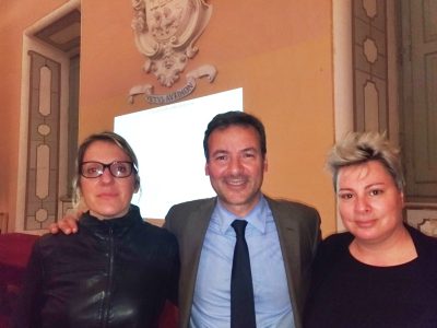 da sin. l’ex consigliera comunale Sara Andreoli, il candidato sindaco e neo consigliere David Monticelli e la candidata al consiglio comunale Raffaella Rango, tutti del M5S Osimo, ieri sera nella Sala Maggiore