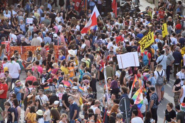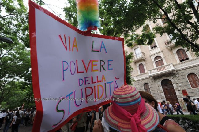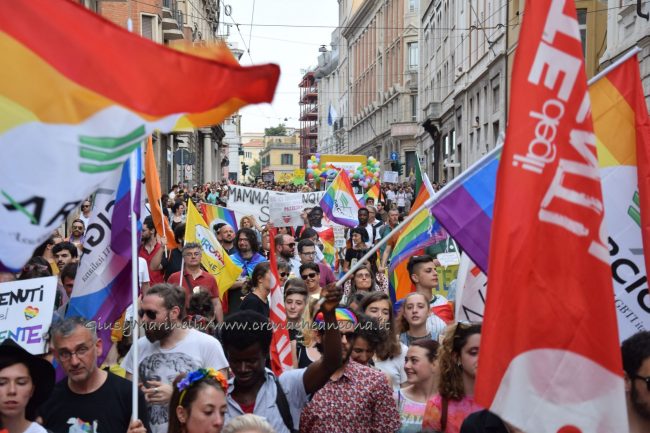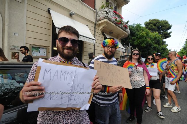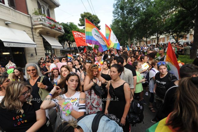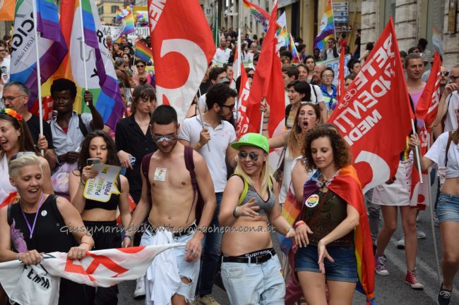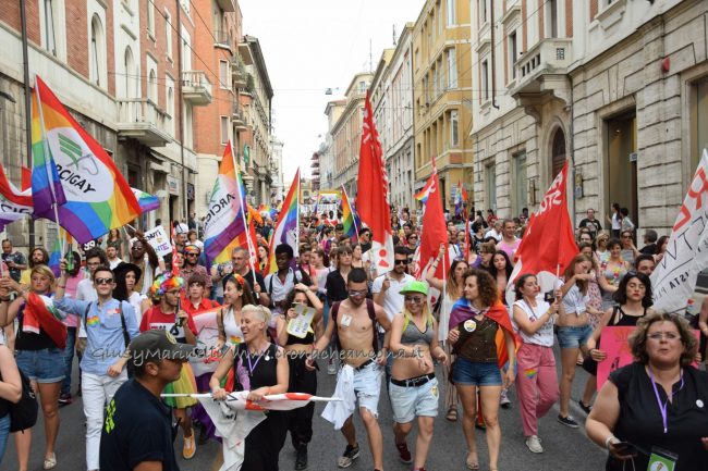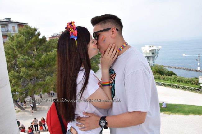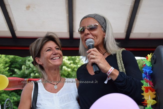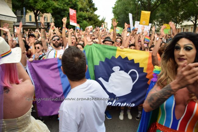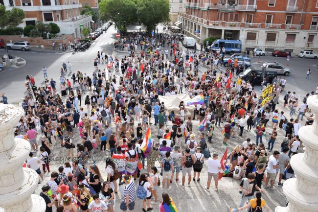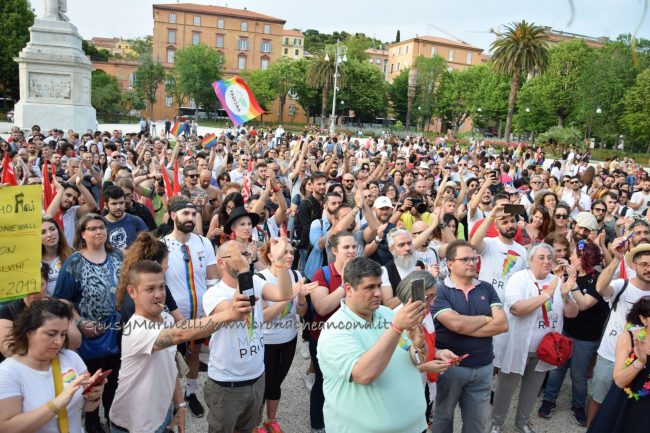 L’onda arcobaleno travolge le vie della città in un turbinio di musica e colori. Il primo Pride marchigiano ha visto la partecipazione di migliaia di persone (5mila secondo gli organizzatori, poco meno di 2mila secondo le forze dell’ordine), che hanno sfilato per le vie del centro a tempo di musica scandita dagli altoparlanti dei camioncini della Cgil e di Arcigay. Partito dal monumento del Passetto, il corteo si è snodato lungo viale della Vittoria e corso Stamira, per poi risalire corso Garibaldi e fermarsi in piazza Cavour. Anticipata questa mattina dalla conferenza alla Mole con l’ex ministro Valeria Fedeli e il presidente nazionale Arcigay Luciano Lopopolo, la sfilata ha visto la presenza, tra gli altri, del garante dei diritti Andrea Nobili, dell’assessore comunale alla Cultura, Paolo Marasca, in veste ufficiale, del consigliere Francesco Rubini (Aic) e delle maggiori sigle sindacali. Madrina dell’evento Antonella Bellutti, per due volte campionessa olimpica di ciclismo: «sono altoatesina di nascita e trentina di adozione, ma sono qui oggi perché mi fa molto piacere prendere parte a questa esperienza per i diritti di tutti, contro le discriminazioni. Gli organizzatori mi hanno chiesto di partecipare ed ho subito accettato». Tra gli slogan scanditi durante il corteo, «Diritti noi vogliamo, indietro non torniamo» e «mamma tranquilla, sono gay mica balilla». Dal palco improvvisato in piazza Cavour, Franco Grillini, simbolo del movimento Lgbt italiano, ha lanciato una stoccata al ministro dell’Interno Matteo Salvini, pur senza nominarlo direttamente: «dico ai politici che esibiscono simboli religiosi come clave, che noi invece esibiamo simboli di pace. Smettetela di presentare la diversità come una minaccia».