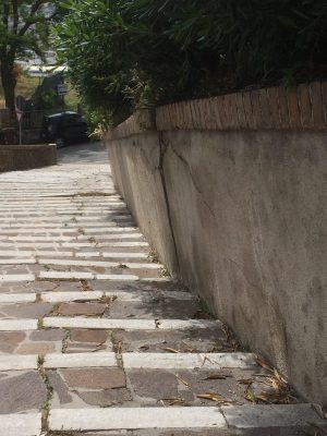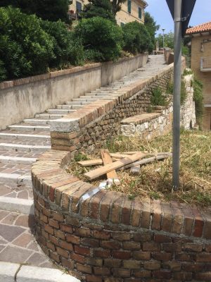 «Abbiamo sollecitato i responsabili municipali, sia con messaggi di posta elettronica certificata sia con telefonate – aggiunge la figlia Ines -, ma tutto quello che sono riusciti a fare è stato piazzare quegli sbarramenti di legno, rivelatisi del tutto inadeguati ad impedire il flusso dei visitatori». Chi fa da sé fa per tre, dunque, si dice. Già, ma non può risolvere un problema così grosso alla radice. Perché di radici si tratta, e il gioco di parole ci sta tutto. E di terra da sempre franosa. Almeno dal 2015-2016, i primi allarmi, un albero più piccolo che viene giù, il terreno della microzona verde in pendio che dà sul selciato a scalini che inizia a gonfiarsi proprio perché le radici del pino centenario – dei veri e propri rami “underground” – spingono da tutte le parti, assieme al terriccio che irretiscono, premendo con forza sul muretto di cinta. E anche questo, soprattutto nella parte centrale dell’itinerario, si gonfia, s’inclina e viene solcato da crepe sempre più vistose. La signora Moretti: «Già allora chiamammo i pompieri, perché notavamo che qualcosa non andava nel nostro impianto fognario, ma ci dissero che era affar nostro, in zona di nostra competenza privata. Vero. E allora mio figlio ha dato una sistemata». Poi il patatrac, col mega pino che dopo forti piogge – le chiome appesantite dall’acqua – in bilico da un pezzo, crolla. Nella scorsa primavera, dopo i due interventi dei vigili del fuoco, e l’evacuazione dell’alto pino, il signor Marco, figlio della Moretti, si rimbocca le maniche. Piazza lungo la scarpata, che dovrebbe essere contenuta in modo efficiente dal muretto a bordo via, dei piccoli terrazzamenti fatti con tubi innocenti e tavolette di legno. Ma non può bastare. La scarpata è solcata da una grossa fenditura che arriva fino alla base circolare del tronco reciso e da un buco. E per quanto la famiglia Sardi-Moretti ce la metta tutta ad isolare impianti igienici ed idrici, quelle profonde cicatrici al suolo non rendono affatto stagna la situazione: è evidente che serve, urgente, un intervento specifico, professionale e magari costoso, da parte di esperti comunali e dell’acquedotto. Intanto, con il caldo di questi giorni, l’atmosfera cupa si appesantisce. «Folate di puzza di fogna durante la settimana, e puzza, a volte, anche dentro alcuni ambienti della casa», confessa la signora Ines. Durante il nostro, di sopralluogo, mentre guardiamo il muretto pericolante e la zona verde devastata, incrociamo per caso un ingegnere e dei tecnici municipali. Si sono accorti – e potrebbe sembrare una specie di beffa – che le transenne di legno poste dal Comune all’inizio della scalinata sono state atterrate da qualcuno. Lo stesso accade periodicamente in cima, sullo sbocco nel piazzale di San Ciriaco. Troppo forte la tentazione di passanti e turisti di andare oltre. «Noi siamo qui per altre incombenze, ma certo è che questa situazione è intollerabile, segnaleremo ai dirigenti», si limita a dire stupefatto e amareggiato l’ingegnere. E’ questa la brutta storia della strada a gradoni senza nome che si arrampica in cima al Colle Guasco, e anche sul lato destro offre una vista da cartolina, su via Birarelli, la chiesa di San Gregorio Armeno, il colle Cappuccini col vecchio Faro ottocentesco. Una cartolina ricercata ma minata da problemi di sicurezza. Con buona pace della legittima vocazione turistica, mai davvero concretizzatasi, di un’Ancona “Bella addormenta (perché sedata dalle istituzioni) sul Golfo”.