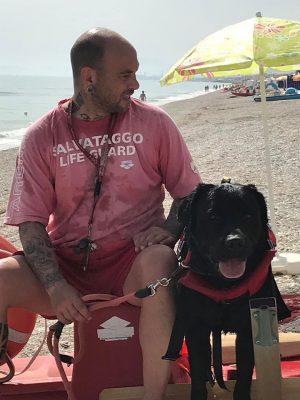 Si chiamano Buck e Becky e insieme a Christian Cavina, il loro umano, fanno parte di un’unità cinofila addestrata a soccorrere persone in mare. Una squadra speciale di labrador che affianca e lavora per tutta l’estate con il conduttore in torretta. Cani-bagnino che con il baywatch scrutano l’orizzonte e sono capaci di salvare vite in acqua. «Per me e Buck è la seconda stagione di lavoro, mentre Becky ha ottenuto il brevetto lo scorso mese di Maggio – racconta Christian, 44 anni, una passione per lo sport e il mare – Lavoriamo a Marina di Montemarciano, nello stabilimento ‘Chateau Chateur’ (ex Waikiki), mentre l’anno scorso abbiamo lavorato alla Polizia e alla Marina Militare. Buck, 5 anni e Becky quasi 4, si alternano nell’affiancamento. Siamo l’unica unita cinofila operativa in tutte le Marche a lavorare in torretta non come volontari, brevettati con la Salvamento Genova». Sulla spiaggia i bagnanti accarezzano i due cani e sono incuriositi dalla loro presenza, una novità per l’estate 2019. Sono sorpresi quando scoprono che per diventare ‘angeli’ del soccorso a 4 zampe in mare servono duri allenamenti da affrontare anche nel gelo invernale.