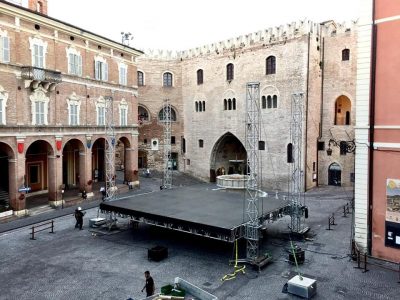 Il palco montato nella piazza centrale di Fabriano per la Creative Cities Conference in programma fino al 15 Giugno
