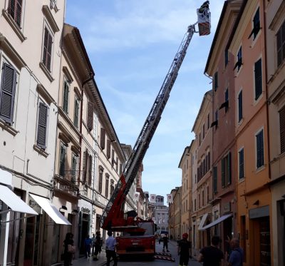 Piccoli pezzi di detriti finiscono sui passanti e in corso Matteotti scatta l’allarme. E’ successo poco dopo le 10 di stamattina, si trattava di porzioni di pochi millimetri che, sebbene staccatesi da un’altezza di 10 metri, non hanno causato danni alle persone colpite. Immediato l’allarme alla Polizia locale e al 115. In corso Matteotti, vicino al civico 14 (vicino alla profumeria Salep) sono intervenuti i vigili del fuoco del distaccamento di Jesi con l’autoscala inviata dal Comando provinciale. I pompieri hanno messo in sicurezza il cornicione, staccando le porzioni di laterizi che rischiavano di cedere ed effettuato la verifica statica dell’edificio. La zona è stata transennata in via precauzionale. Un intervento durato circa due ore.