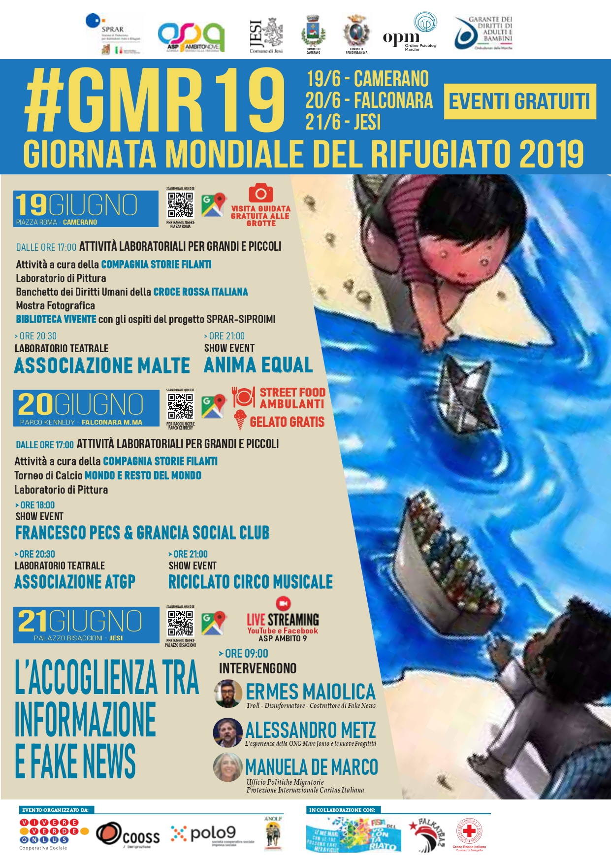 In occasione di questa Giornata Mondiale del Rifugiato l’Asp ambito 9, in collaborazione con il Raggruppamento Temporaneo di Imprese (RTI) a cui è stato affidato il servizio, organizza la manifestazione nei giorni 19-20-21 Giugno 2019 in tre Comuni diversi: Camerano, Falconara Marittima e Jesi. Lo scopo è quello di far comprendere alla cittadinanza il lavoro svolto dai Comuni e dalle Cooperative, i servizi attivati a favore dei beneficiari, le loro storie e il loro percorso. Il 19 Giugno si terrà la manifestazione a Camerano presso Piazza Roma dalle ore 17 con attività ludiche per bambini e ragazzi ed intrattenimenti vari (concerto). Il 20 Giugno si terrà la manifestazione a Falconara Marittima presso il Parco Kennedy dalle ore 17 con attività ludiche per bambini e ragazzi ed intrattenimenti vari come un concerto. Il 21 Giugno si concluderà la manifestazione a Jesi con il Convegno “L’accoglienza tra informazione e fake news” presso il Palazzo Bisaccioni dalle ore 8:30, che vedrà diversi professionisti affrontare tematiche legate all’immigrazione ed alle fake news. L’accesso per tutte le tre Giornate è libero e gra