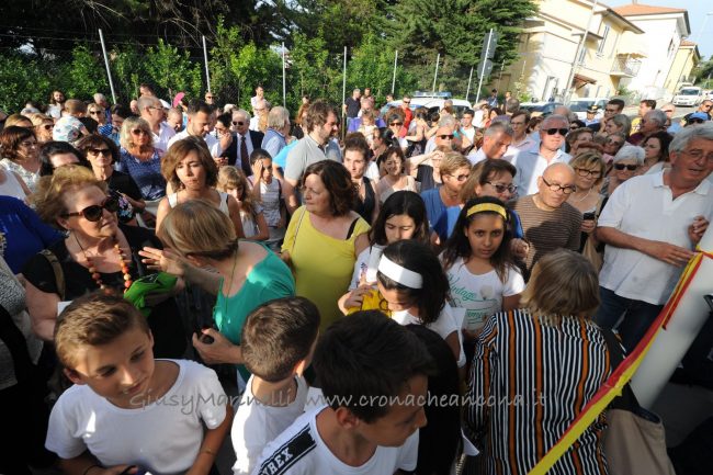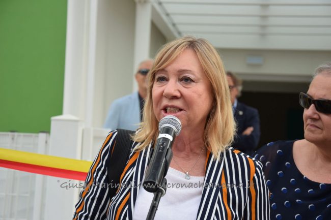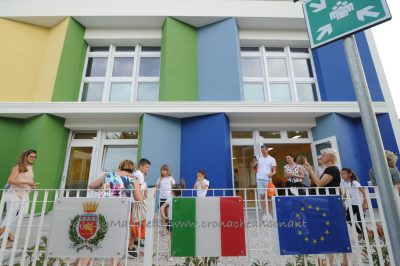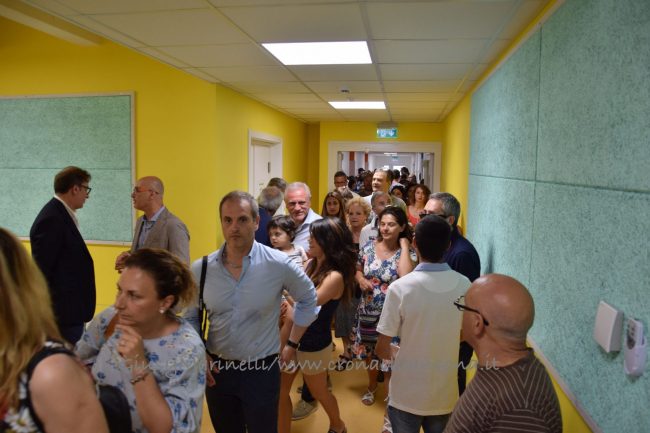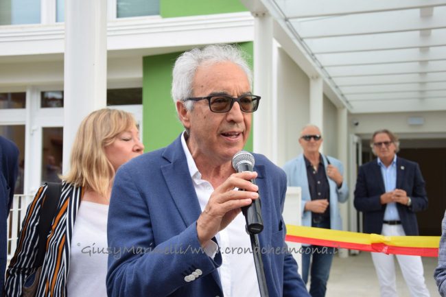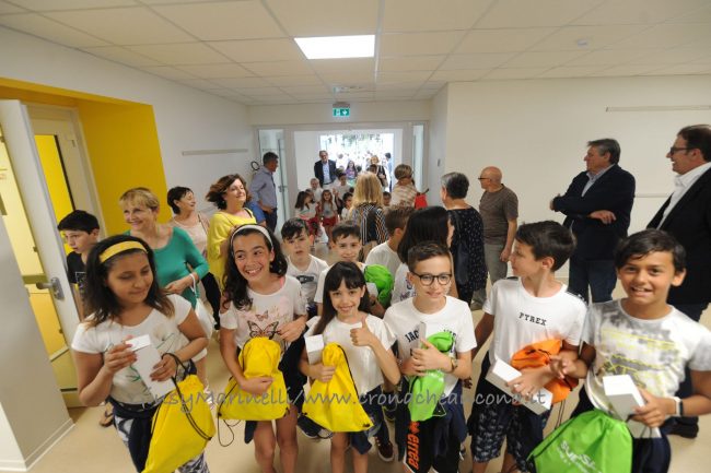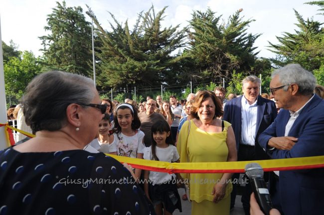ANCONA – La struttura che ospiterà le scuole primarie e dell'infanzia di Palombina riaprirà i battenti da settembre, ma intanto oggi si è celebrata la rinascita dell'istituto, con tanto di benedizione e taglio del nastro. Mancinelli: «viene voglia di tornare piccoli»