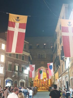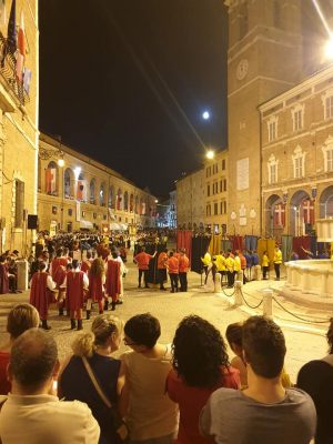 Migliaia di persone, ieri sera, domenica 16 Giugno, hanno ammirato il corteo storico per le vie del centro di Fabriano. Il Palio di San Giovanni Battista è entrato nel vivo con più di 500 figuranti che hanno sfilato nel cuore della città della carta. Poche ore prima in tanti avevano preso parte alla Magnalonga medievale e alla gara podistica all’interno delle mura della città. Questa sera Intanto lunedì 17 giugno, alle 21:30 l’appuntamento è in piazza del Comune per La Giostra dei giochi popolari. Albo d’onore: Pisana 7 vittorie (tra cui quella dell’anno scorso), Borgo 5, Piano 4 e Cervara 2. Soddisfatto il presidente dell’Ente Palio, Sergio Solari, che anche ieri ha potuto vedere i tanti turisti arrivati soprattutto dal centro e dal nord Italia, per ammirare e fotografare le quattro infiorate artistiche (C’è tempo fino al 24 giugno).