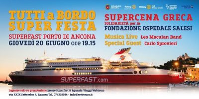 Giovedì 20 giugno si svolgerà un evento benefico a bordo della nave Superfast XI nel porto di Ancona organizzato da Rotary Club Ancona – Rotary Club Ancona Conero – Morandi Group – Fondazione Salesi – Comune di Ancona. Sarà un evento ricco di sorprese a sostegno dei progetti che la Fondazione realizza ogni giorno per i piccoli pazienti del Salesi. Una serata intensa: musica dal vivo con Leo Maculan Band e special Guest Carlo Sprovieri. Cena con specialità greche, ospiti speciali, solidarietà, cultura e tanti premi: