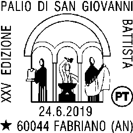 Poste Italiane, in occasione della XXV edizione del palio di San Giovanni Battista, su richiesta dell’Ente Autonomo Palio San Giovanni, ha approntato un servizio temporaneo con speciale annullo postale che si potrà ottenere martedì 24 giugno dalle 9 alle 14 presso il Locale Ente Palio, Piazza del Comune, 35. Nei giorni successivi alla manifestazione, i marcofili e coloro che volessero richiedere gli annulli possono inoltrare le commissioni a Poste Italiane / U.P. Fabriano / Sportello filatelico Piazzale Giambattista Miliani, 19 – 60044 Fabriano (AN) (tel. 0732 639211)