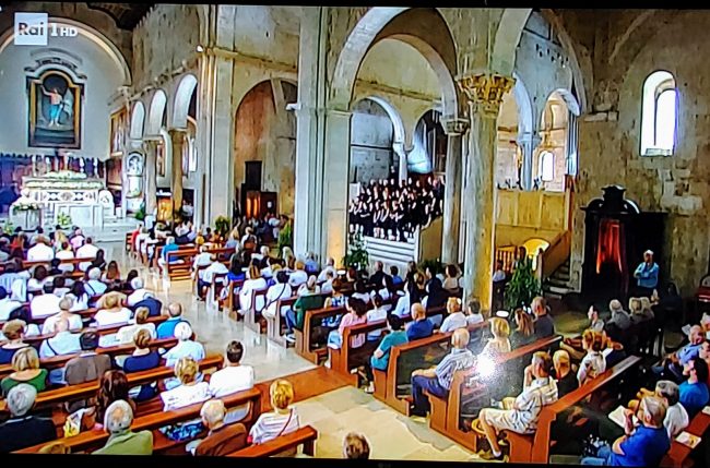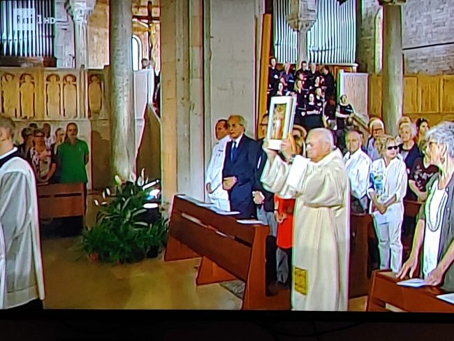 Ancona in televisione. E’ stata trasmessa questa mattina su RaiUno la santa messa in diretta da San Ciriaco, diretta da monsignor Angelo Spina e da Giuliano Nava e Nazzareno Centioni. La celebrazione trasmessa in tv fa parte della serie di iniziative dell’Arcidiocesi Ancona-Osimo promosse per ricordare la partenza, 800 anni fa, di San Francesco dal porto dorico per raggiungere l’oriente. Un primo passo per cercare il dialogo tra religioni e culture diverse. Prime dalla santa messa, Raiuno ha trasmesso delle immagini panoramiche della città: da Portonovo, all’attività della pesca al Mandracchio, fino a luoghi simbolo di Ancona: Santa Maria della Piazza, San Francesco e  la cattedrale di san Ciriaco.