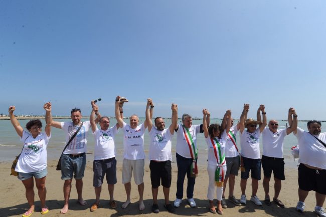 «Una ferita all’ambiente, al paesaggio e anche all’anima, perché quest’opera impedirebbe la vista del mare», ha sottolineato al microfono – con amplificatori che hanno permesso di diffondere il messaggio lungo entrambi i lidi – Luigi Galatello, portavoce del comitato «No al muro, Sì al mare» di Falconara, che ha organizzato la manifestazione di protesta insieme al Comune e con il sostegno della Pro Loco Falconamare e del consorzio Falcomar, che raccoglie gran parte degli operatori balneari falconaresi.