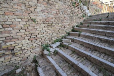 Hanno preso atto dell’estremo degrado e delle condizioni pietose e disastratissime in cui è cronicamente ridotto da troppi anni uno dei più affascinanti itinerari del colle Guasco. E hanno inviato una missiva allarmante e dai toni perentori al Comune e alla stessa Soprintendenza. Per motivi diversi ma strettamente interconnessi. «Qui dove la sindaca Mancinelli non ci passa di sicuro»- così si era sfogato uno dei pochi residenti di via Rupi -, l’Amministrazione comunale deve provvedere al più presto a ripristinare le condizioni per una percorribilità in piena sicurezza. Questo, in sostanza, il contenuto della missiva inoltrata ai piani alti di Palazzo del Popolo, che ha la sua principale sede proprio nell’elegante e monumentale Palazzo degli Anziani (vi si riuniscono Consiglio e commissioni municipali, vi sono uffici importanti dell’ente locale). Il Comune è, paradossalmente, proprietario della via e di quasi tutta la zona panoramica – nonostante tutto ancora affascinante e seducente – che la circonda tuffandosi verso il porto. Valeria Mancinelli, in qualità di sindaco, in base alla legge, sarebbe la prima a dover adottare i provvedimenti sollecitati dal Ntpc per ristabilire condizioni ambientali vivibili ed eliminare pericoli incombenti per chi passa. Per ricucire una delle più belle cartoline di “Ankon Dorica” strappata da decenni di assenza di cure e manutenzione. Una cartolina strappata da muretti a bordo via, e non solo, pericolanti, lesionati. Da distacchi di mattoni e vecchie pietre di costruzione che, come trappole, giacciono lungo i gradini. Dalle crepe più o meno lunghe e profonde che feriscono il selciato in più punti, e che, percorsi alcuni metri dall’ingresso del sito scendendo da piazza Stracca, hanno diviso in due una scalinata, facendone abbassare longitudinalmente il livello. Una cartolina stracciata dall’illuminazione precaria o inesistente, dai rigonfiamenti del piazzale con vista mare a metà percorso, dagli spuntoni di ferro arrugginito che fuoriescono dalle opere edilizie, dalle erbacce e piante infestanti che hanno conquistato ampi spazi di suolo pubblico, fittissime e anch’esse pericolose.