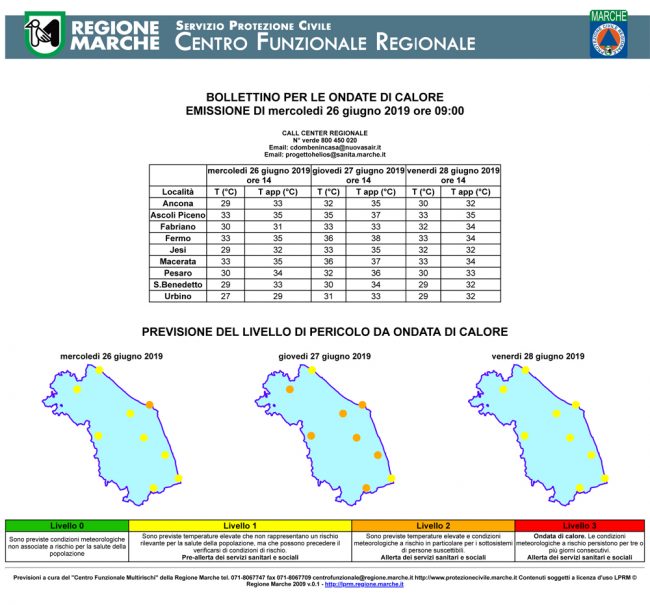 L’anticiclone nord africano farà sentire i suoi effetti anche sulle Marche a partire da domani e fino al termine di questa settimana, con temperature massime comprese tra i 29 ed i 34 gradi a seconda delle diverse località. Per domani, giovedì 27 Giugno, il bollettino per le ondate di calore emesso alle 13 dal Centro Funzionale della Protezione Civile Regionale delle Marche indica il bollino arancione (livello 2 di pericolo da ondata di calore) su Urbino, Ancona, Jesi, Fabriano, Macerata, Fermo e Ascoli e bollino giallo (livello 1) invece su Pesaro e San Benedetto del Tronto. Secondo la scala di pericolosità indicata nel bollettino con il bollino arancio si prevedono:«Temperature elevate e condizioni meteorologiche a rischio in particolare per i sottosistemi di persone suscettibili. – Allerta dei servizi sanitari e sociali». L’allungamento della parte superiore del promontorio anticiclonico di matrice africana anche verso la nostra regione porterà un significativo aumento delle temperature a partire quindi dalla giornata di domani. L’ingresso di aria più fresca dai Balcani riporterà le temperature ai livelli di inizio settimana nelle giornate successive.