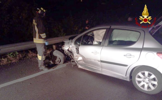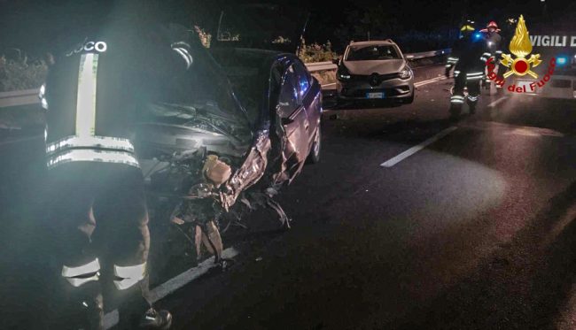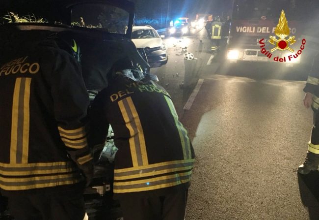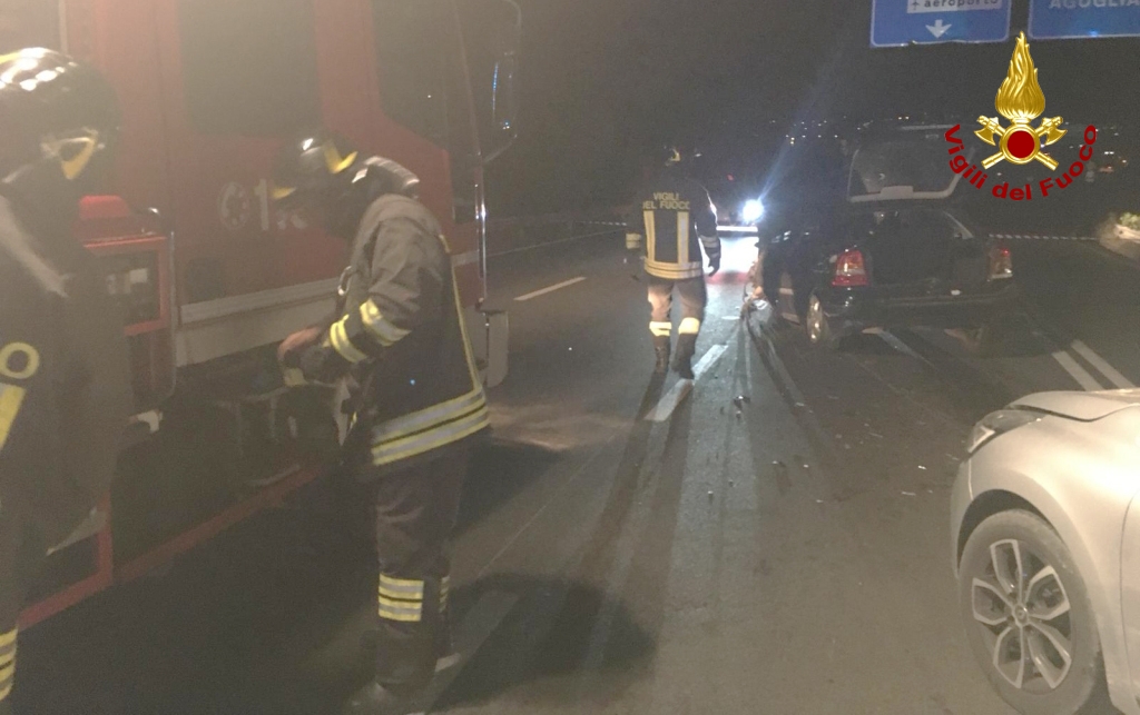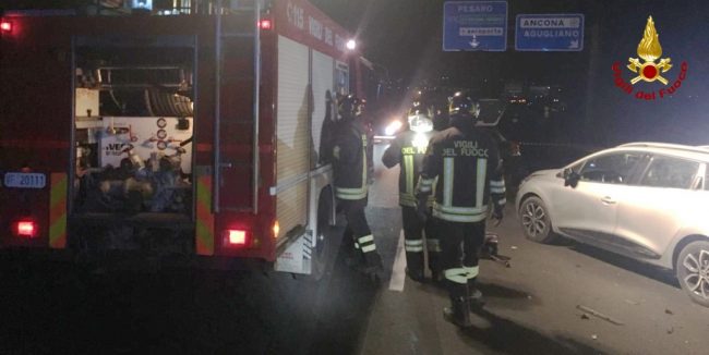 Incidente stradale con carabola tra 4 mezzi intorno alle 3 di stanotte, ad Ancona sulla Statale 16-variante nord in prossimità dell’uscita di Ancona-Agugliano. Il bilancio è di due feriti, non gravi, trasportati al pronto soccorso dell’ospedale di Torrette. Per cause in fase di ricostruzione da parte della Polizia Stradale di Ancona, due vetture si sono scontrate coinvolgendo poi nell’incidente altri due mezzi. Nell’urto i conducenti delle due auto entrate per prime in collissione, il 55enne C.U. e il 34enne M.E. residenti in provincia e nella zona, sono stati consegnati alle cure del personale del 118 che li ha trasferiti all’ospedale regionale per accertamenti. I vigili del fuoco di Ancona hanno prestato soccorso agli infortunati e hanno messo in sicurezza lo scenario dell’incidente, fornendo illuminazione agli agenti della Polstrada impegnati a verbalizzare gli estremi della complicata dimanica del sinistro (che per fortuna si è risolto solo con danni consistenti sui mezzi), e al successivo recupero dei mezzi coinvolti nello scontro.