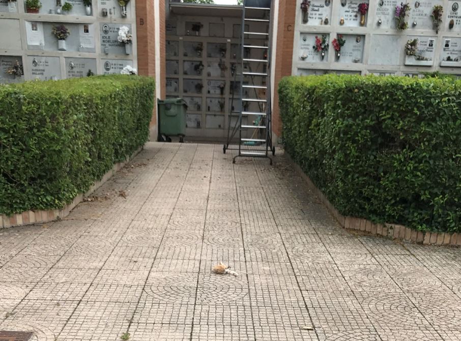 La testa di un gattino mozzata lasciata al centro del cimitero di Colmurano. Un episodio agghiacciante che è stato segnalato ai carabinieri da un residente, Andrea Seri, che questa mattina ha fatto la macabra scoperta. Le foto inviate in redazione da Seri sono immagini forti che evitiamo di mostrare (se non uno scatto da lontano). «Sembra un taglio provocato con un’accetta, questa è l’impressione che ho avuto vedendo la testa dell’animale – dice Seri che dopo aver trovato i resti della bestiola ha subito chiamato i carabinieri –. Sono scioccato».