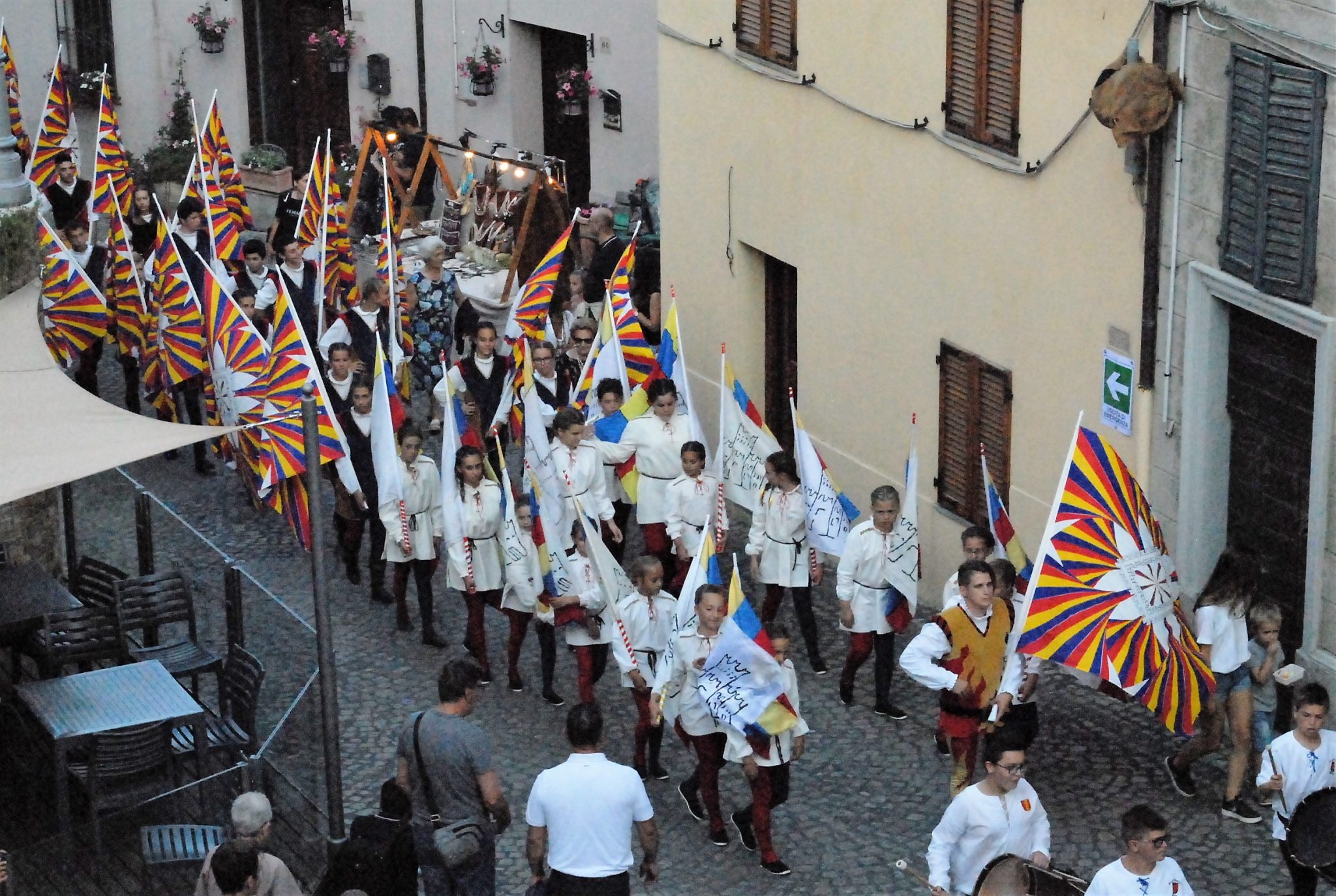 Ottima affluenza di pubblico sabato sera per il debutto della 32esima edizione delle rievocazioni storiche di Offagna. L’Araldo in costume d’epoca ha dato il via con il bando di lettura davanti alla chiesa del borgo e poi ha fatto tappa nelle taverne dei quattro rioni per annunciare la sfida della Contesa della Crescia. Nella cerimonia di apertura tra i personaggi in costume si sono aggregati anche gli sbandieratori che hanno subito animato le vie del centro storico. Offagna Borgo Medioevale entra ora nella due giorni di Disfide in Armi. Lunedì 22 e Martedì 23 luglio le quattro prove nell’utilizzo della mazza, della lancia, della balestra e dell’arco con i rappresentanti dei rioni Croce, Sacramento, San Bernardino e Torrione che cercheranno di raggiungere il punteggio più alto per conquistare la Contesa della Crescia e dunque issare il proprio vessillo sul Mastio della Rocca. Se vincesse il Torrione come nel 2018, conquisterebbe il Palio che spetta solo a chi fa sua la Contesa per due anni consecutivi.