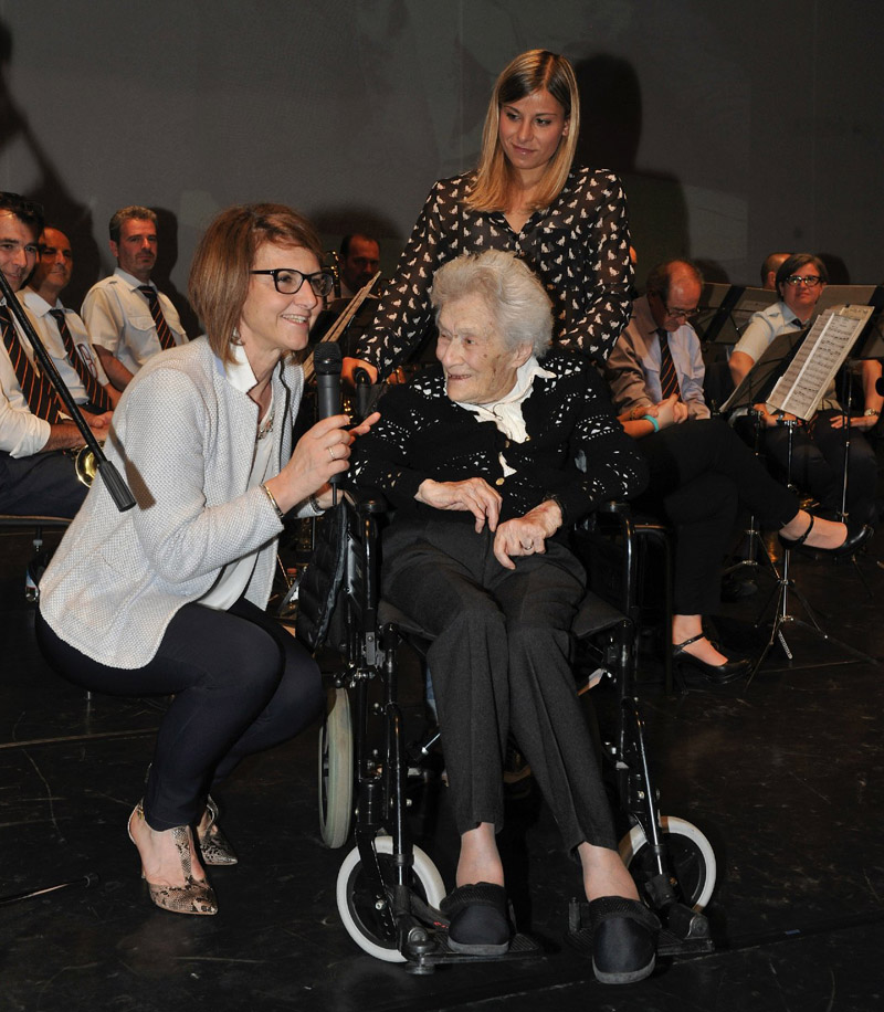 Paola Andreoni con Elena Giorgetti Donnini, al tempo 102enne, nel 2015 al teatro ‘La Nuova Fenice’ di Osimo