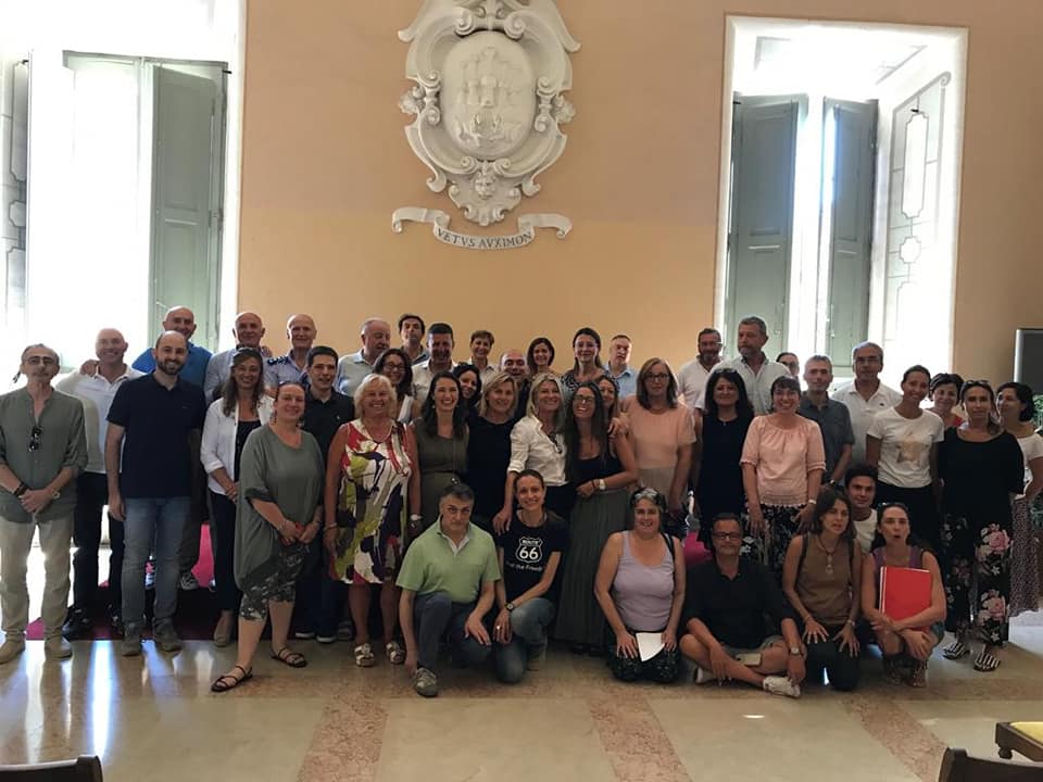 La foto ricordo dei dipendenti comunali di Osimo, degli assessori e del sindaco con Roberta Verdenelli (al centro in camicia bianca)