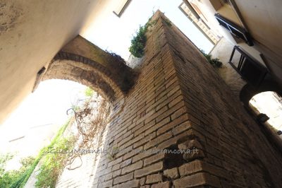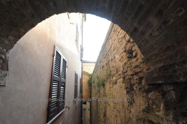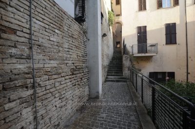 La passeggiata prosegue in ripida salita, tortuosa, con svolte a 90°, con alcune lunghe parti a gradini, una specie di moderno ponticello in ferro sospeso a margine di un cortile deserto, e altri metri e metri di selciato sconnesso. Oscuro anche di giorno, stretto, incuneato tra i palazzi che salgono in quota fino a piazza San Francesco, lo stradello è incorniciato, più volte, in alto, da suggestivi archi ed archetti, balconcini. E nonostante tutto conserva parte del fascino che ha avuto per secoli. Quando vi si incontrava il popolino dei residenti e dei lavoratori del quartiere porto (anch’esso raso al suolo dalla guerra), ma anche qualche famiglia nobile o della borghesia altolocata. Odori e profumi di cucine casalinghe, i colori dei panni stesi e delle piante fiorite curate dalle massaie, l’eco delle chiacchiere sotto l’uscio di modeste casette… tutto sparito. Restano cocci, pezzi di intonaco distaccatisi al suolo, bottiglie rotte, fenditure e buchi nelle murature, cavi elettrici e di servizio allo scoperto, piante infestanti, scritte in vernice spray e dilagante sporcizia.