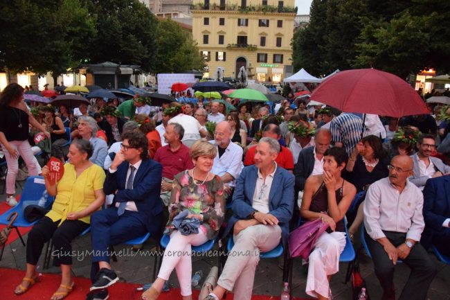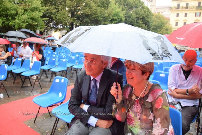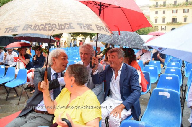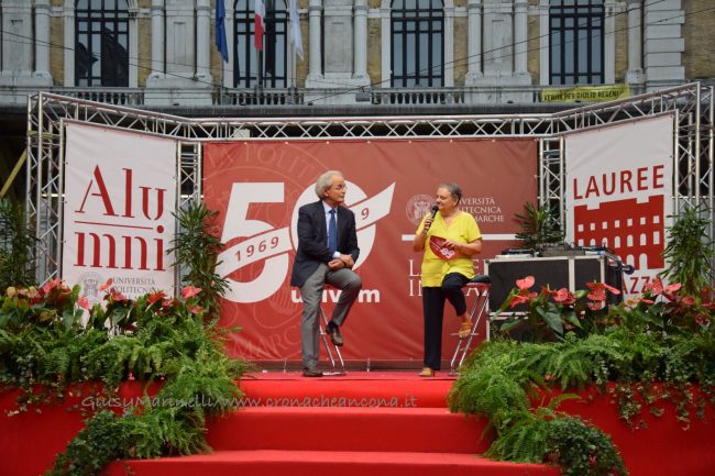 «Associazione bagnata, associazione fortunata». La butta sull’ironia il rettore Sauro Longhi, aprendo le danze per i festeggiamenti sotto la pioggia dei 50 anni dell’Università Politecnica delle Marche, con la prima reunion di tutti i laureati dell’Ateneo – organizzata dalla neonata associazione Alumni Univpm per oggi in piazza Roma – battezzata da un meteo avverso che ha provocato un fuggi fuggi tra la platea. Ma siccome «the show must go on», si è comunque andati avanti con il programma, con il rapper Frankie Hi-Nrg, special guest della serata, che ha presentato la sua opera ‘Faccio la mia cosa’ e si è esibito nella libreria Mondadori anziché sul palco. Prima del trasferimento improvvisato, Longhi ha ricordato come «ieri questa piazza era piena di giovani che credono nel futuro – ha sottolineato parlando della due giorni delle lauree in piazza –, e io sono ottimista che sarà un futuro migliore, come sono ottimista sul fatto che oggi non pioverà». Purtroppo le nuvole che nel frattempo si addensavano su piazza Roma non hanno assecondato le pie speranze sul meteo del rettore, affiancato sul palco dalla sindaca Valeria Mancinelli che ha evidenziato come «oggi sia l’ennesima testimonianza del rapporto sempre più stretto tra l’università e città, che ne è stata la culla».