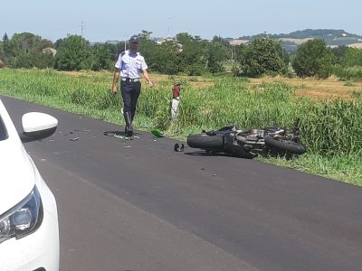 Un violento scontro si è verificato poco dopo le 14 in via Piandelmedico, nei pressi della rotatoria dello svincolo di Jesi ovest della superstrada 76. Ferito un centauro di 35 anni, trasportato in ambulanza al pronto soccorso di Torrette con un codice rosso. Secondo una prima ricostruzione della Polizia locale intervenuta sul posto, sembra che il ragazzo in sella alla sua potente Kawasaki Ninja si sia scontrato con un’auto – una Peugeot 308 – che procedeva dalla rotatoria in direzione Jesi. Un impatto violentissimo in seguito al quale il centauro è stato sbalzato sull’asfalto, cadendo rovinosamente dalla moto. Per fortuna indossava il casco che ha attutito la caduta preservandolo da eventuali traumi alla testa. Il giovane è rimasto sempre cosciente anche durante i soccorsi. L’automobilista si è fermato a lanciare l’allarme al 118, facendo convergere sul posto l’automedica, l’ambulanza della Croce verde e una pattuglia della Polizia locale. Il centauro, ferito e dolorante, è stato trasferito al pronto soccorso dell’ospedale regionale di Torrette per le cure del caso. Le sue condizioni sono gravi, ma non dovrebbe essere in pericolo di vita. Illeso invece il conducente della vettura, che è stato sentito dalla Polizia locale per la ricostruzione della dinamica: non è chiaro se si sia trattato di un tamponamento o di un urto durante una manovra. Sarà chiarito dalla Polizia locale sulla scorta dei rilievi di legge. Via Piandelmedico è rimasta chiusa durante le operazioni di messa in sicurezza e rimozione dei mezzi coinvolti.