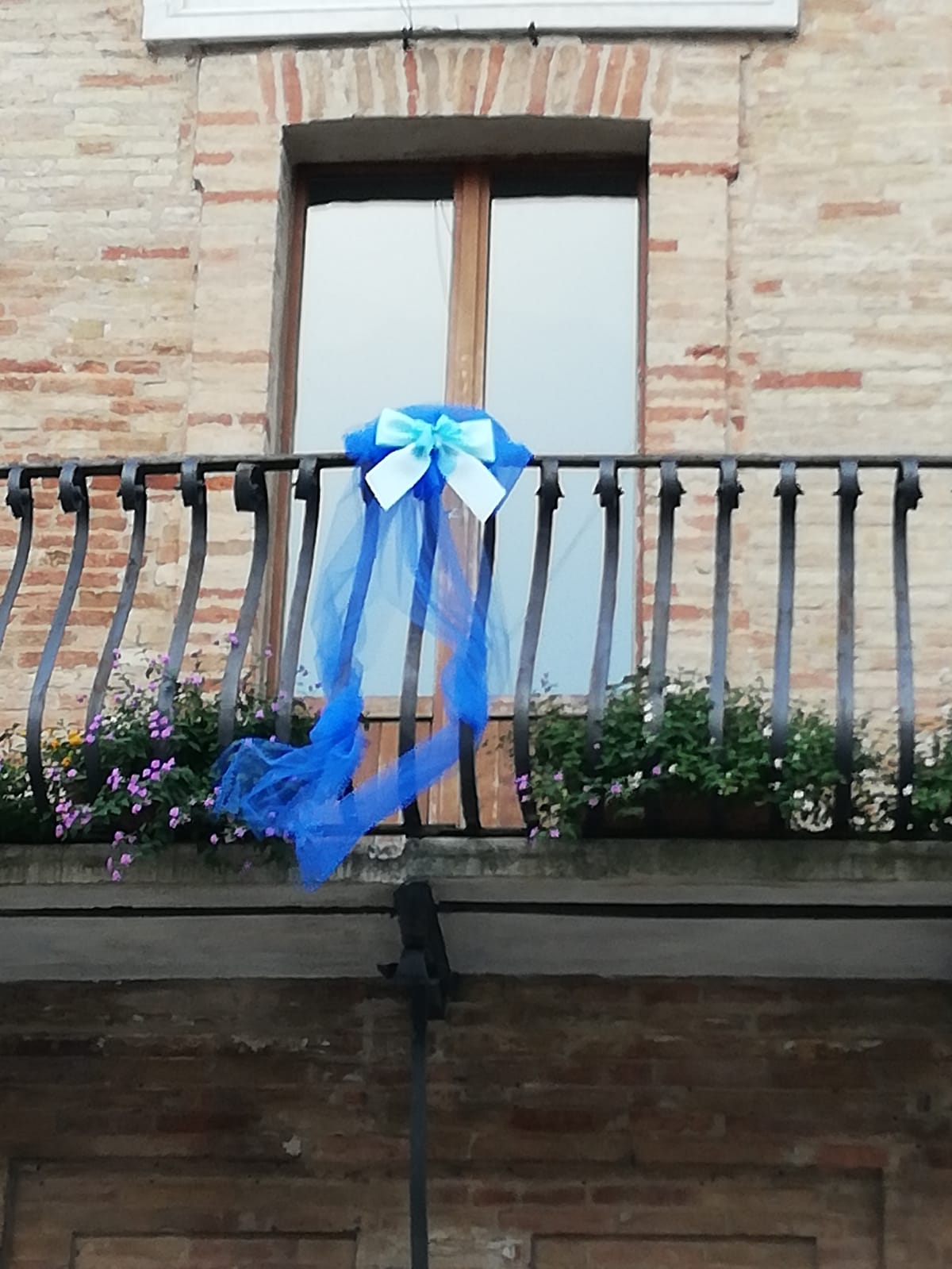Il fiocco azzurro esposto sul balcone del palazzo comunale di Castelfidardo per annunciare la nascita del piccolo Michael