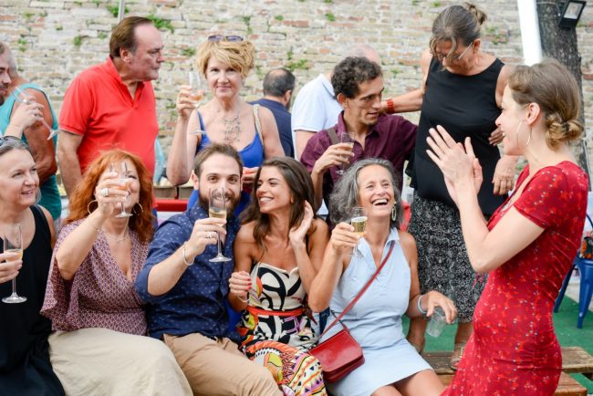 Giovanni: eh ma questo lo racconto io! Il primo contatto con lei l’ho avuto proprio quel giorno, il 7 aprile 2018. Sono arrivato a Macerata per la prima volta in vita mia, un po’ spaesato, perché non conoscevo il posto, non conoscevo nessuno, e anche perché Vick mi aveva solo detto di venire ma nulla di cosa dovessi fare. Lì mi ha fatto cantare, e il coreografo ci ha fatto fare degli esercizi di conoscenza fra tutti noi. E mentre giravo, ho visto questa ragazza vestita di giallo, aveva una maglietta gialla bellissima, che era proprio un sole. All’epoca ero fidanzato, ma mi aveva colpito molto. Poi, finito il workshop, ci siamo messi tutti in fila perché lei segnava i nominativi delle persone, e quando è arrivata a me ho detto “ma devo scriverlo anch’io il mio nome?”, e lei sostiene che lo abbia detto andando a due millimetri dal suo viso.