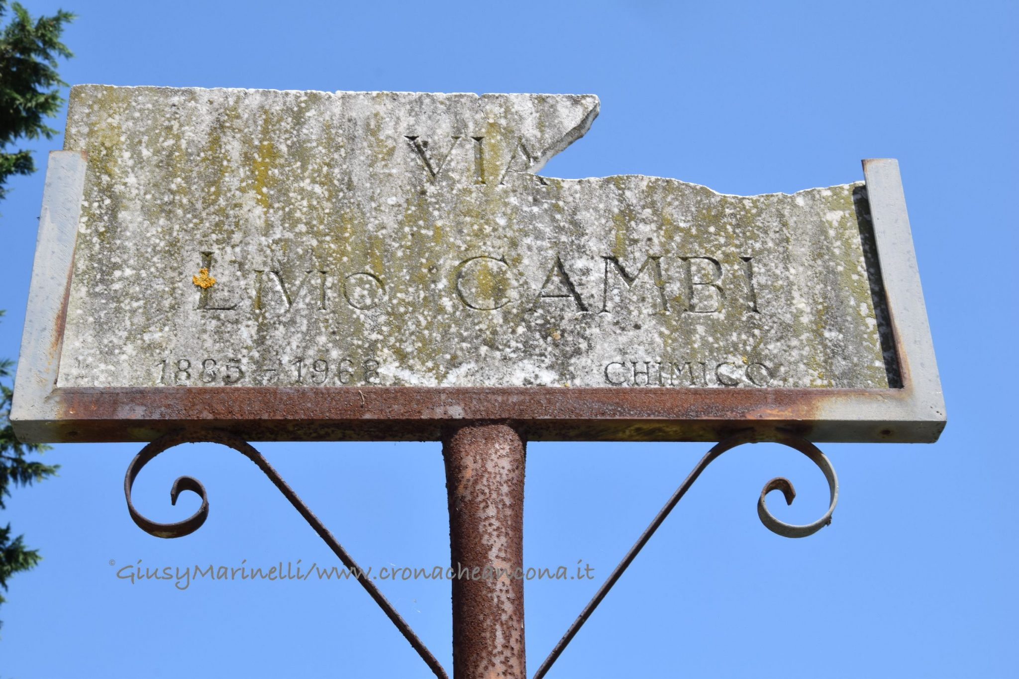 Il cartello in pietra con inciso “Via Livio Cambi” sembra un reperto archeologico dell’Ancona romana. Totalmente ingrigito e profondamente corroso, mancante di un pezzo, col palo di sostegno e la cornice in ferro vittime della ruggine, non fa certo onore alla memoria del famoso chimico nato nella Dorica e deceduto nel 1968.