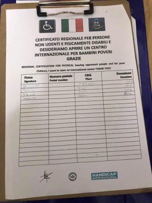 Il foglio per la raccolta fondi della truffa dei sordomuti