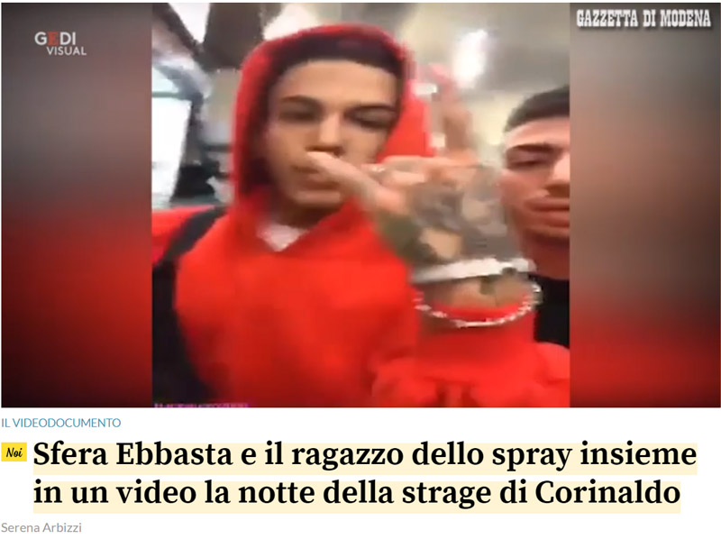 La Gazzetta di Modena pubblica un video che riprende accanto all’artista proprio Ugo Di Puorto, il giovane di 19 anni di San Prospero arrestato per la strage nel locale con altri 5 complici e con un 65enne accusato di ricettazione. Nei pochi secondi della clip postata e poi rimossa dallo stesso Di Puorto sul suo profilo Instagram, si vede in primo piano il cantante che mima il gesto del cucirsi la bocca e il 19enne, che avrebbe lasciato tracce del suo dna sui tappi delle bombolette spray al peperoncino ritrovate alla Lanterna Azzurra, alle sue spalle mentre come un qualsiasi fan gli risponde:«Sta facendo i soldi mentre voi parlate, parlate, guardatelo».