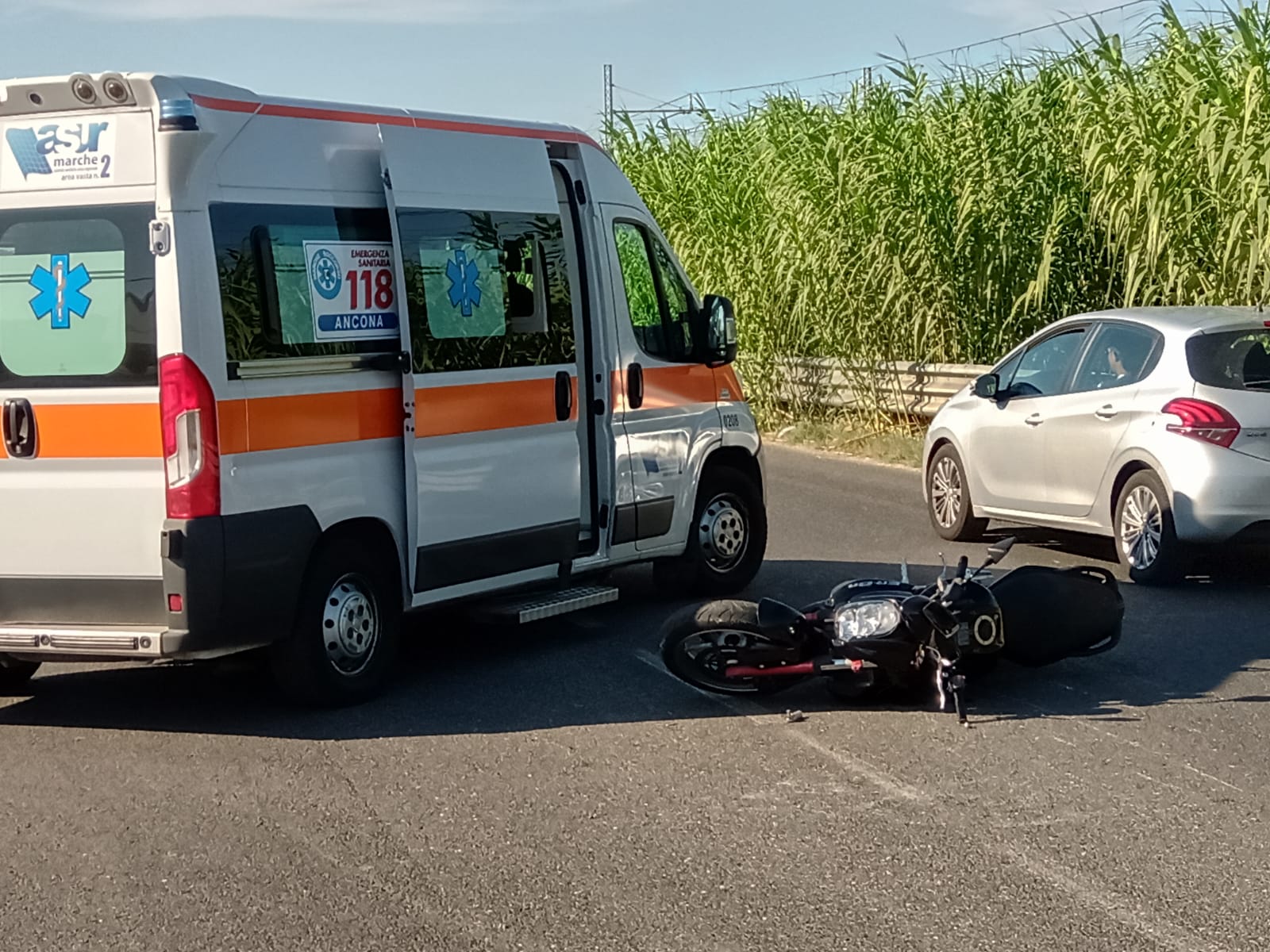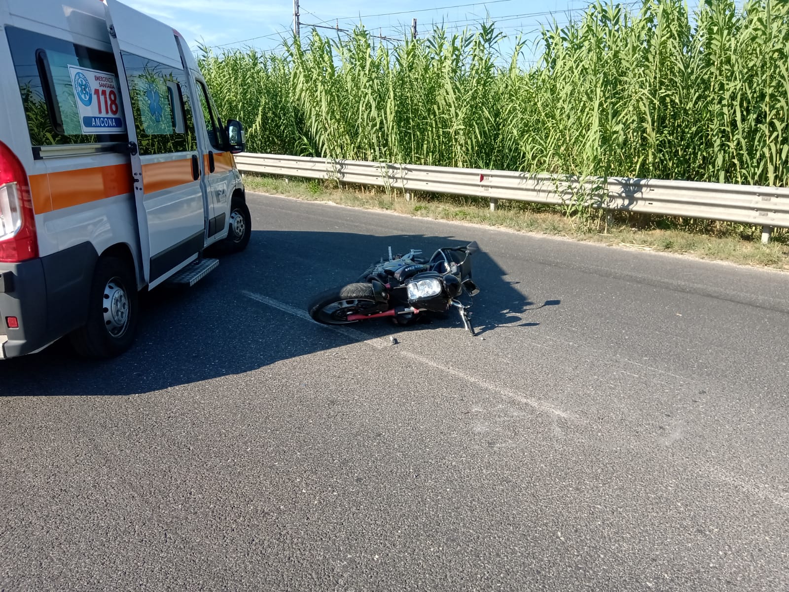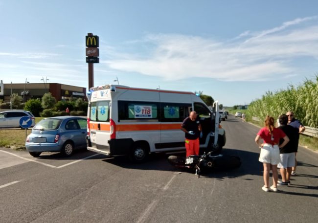 La moto finita sull’asfalto della Statale 16 oggi pomeriggio davanti al Mc Donald’s di Osimo Stazione
