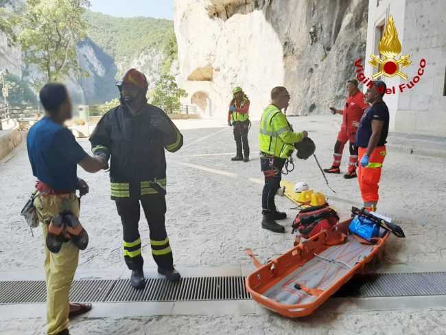 Il primo ad intervenire un vigile del fuoco fuori servizio, che si trovava a pochi metri di distanza poiché impegnato nell’arrampicata. Sul posto sono intervenute l’eliambulanza e l’ambulanza della locale Croce Rossa, insieme a una squadra dei vigili del fuoco di Fabriano. Il medico si è calato con il verricello e ha prestato le prime cure del caso al religioso, che non indossava il caschetto di protezione. Visto che le sue condizioni non erano gravi, e quindi non era necessario il trasporto a Torrette, il frate è stato affidato agli uomini del corpo nazionale soccorso alpino speleologico e ai vigili del fuoco di Fabriano arrivati con un fuoristrada su cui il ferito è stato fatto salire per scendere a valle. Raggiunta la gola l’ambulanza della Croce Rossa di Sassoferrato ha trasportato il frate all’ospedale Profili di Fabriano: ha riportato ferite al volto ed escoriazioni alle gambe.