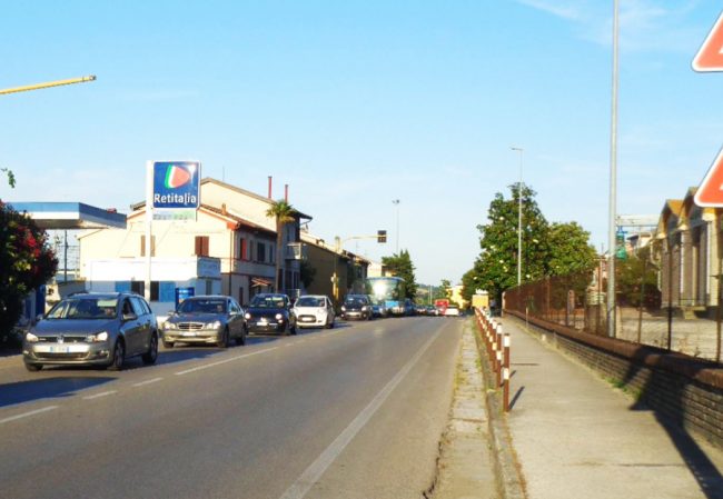 La Statale 16 all’ingresso di Osimo Stazione e, a destra, il capannone del consorzio agrario