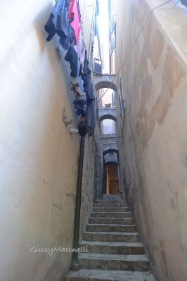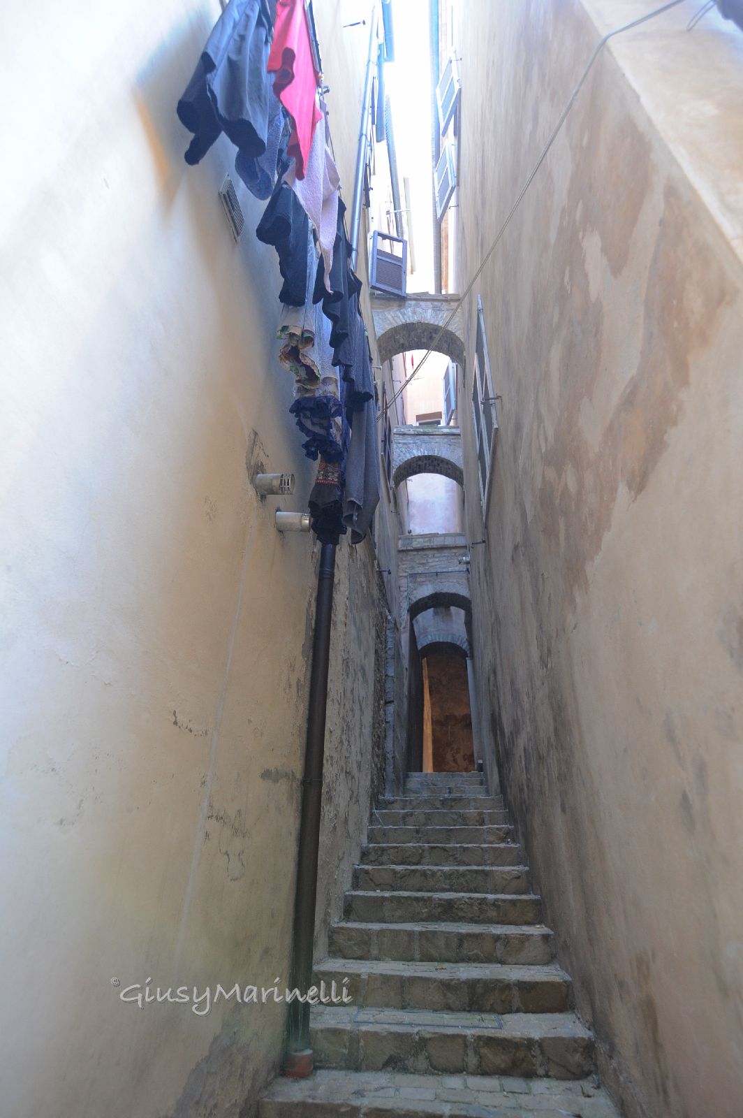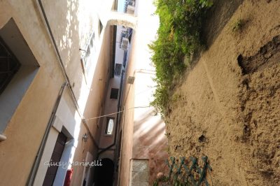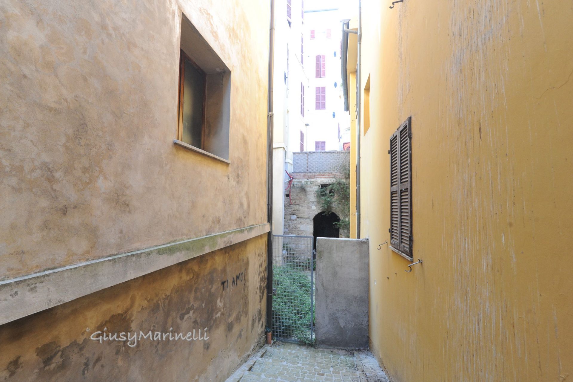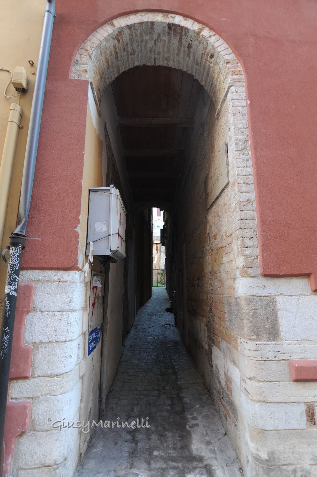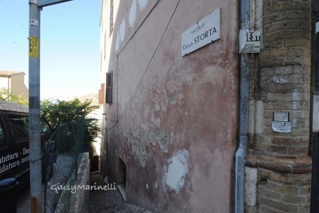 “Il nome rispecchia l’andamento del vicolo, che con tratti di pendenza variabile, posti quasi perpendicolarmente tra loro, rendeva più breve la discesa verso il porto”, scriveva nel 1979 l’architetto e storico Vincenzo Pirani nel suo saggio “Ancona dentro le mura”. Già, la “Storta”. Scalinate e parti in selciato che si alternano deviando, “storcendosi” improvvisamente a 90°. Archi, archetti, percorsi al coperto in gallerie voltate e buie, ardite congiunzioni murarie tra edifici, piccoli slarghi dove la luce del sole riconquista la sua forza e illumina alcuni panni stesi e finestrelle munite di inferriate. Sensazioni vertiginose, che scompaiono solo quando, attraversato l’ennesimo “tunnel” oscuro, dopo alcuni metri allo scoperto ci si deve arrestare, sempre in discesa, davanti al primo sbarramento del percorso, un portone in legno rete e cemento. Oltre, un massiccio rudere plurisecolare in uno spiazzo coperto da vegetazione. Occorre risalire, indietro, e raggiungere l’altro ingesso giù in fondo, in via Saffi. Si passa sotto un dritto cunicolo, parallelo allo storico Palazzo Pichi (origine XIV secolo) che all’uscita impatta contro l’altro sbarramento, una lunga struttura in rete. Di là quella destinata, in teoria, ad essere una bella piazzetta. Sulla destra un palazzo di quattro piani, quello terra ancora non risistemato, come congelato ai tempi di Ancona libero Comune. Così come la grande murata sul lato opposto della rete, evidente resto di un edificio medievale. Da lì il vicolo prosegue a sinistra, sotto una delle citate gallerie voltate.