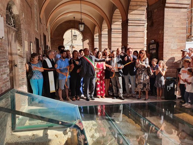 Inaugurato stamattina alle 9.30 il pavimento in vetro del loggiato comunale, che lascia intravedere i reperti archeologici nel sottosuolo. Alla cerimonia del taglio del nastro, organizzata nella giornata di festa del patrono, hanno partecipato il sindaco con la giunta e don Dino Cecconi, parroco della cattedrale che ha benedetto l’opera. Dalle vetrate si intravedono i resti della chiesa di Santa Maria dell’Assunta e poi della seicentesca chiesa della Piazza costruita al suo posto e demolita in seguito per far spazio proprio alle logge di Palazzo Comunale. Nella profondità giace ancora la pavimentazione lastricata del foro romano. Ad ottobre verrà esposto nella vetrina anche il busto la statua di Plotina, rinvenuto durante gli scavi e ora ospitato nella sezione museale archeologica di Palazzo Campana.