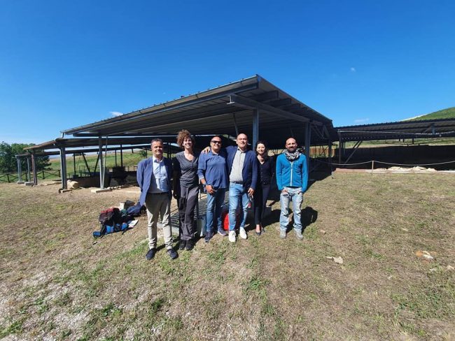 Il sindaco Simone Pugnaloni (terzo da destra) e l’archeologo della Soprintendenza Stefano Finocchi insieme all’archeologa responsabile dell’equipe di ricercatori belgi, e agli assessori Michela Glorio e Mauro Pellegrini sull’area archeologica di Montetorto