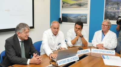 «Qui c’è un luogo accogliente, di alta qualità e di grande umanità che testimonia che non dobbiamo uscire dalla regione per trovare le risposte migliori al bisogno di salute dei marchigiani». Così il Presidente Regione Marche, Luca Ceriscioli, questa mattina al ‘Lancisi’ Dipartimento di scienze cardio-vascolari degli Ospedali Riuniti di Ancona. Oggi si festeggiano risultati eccellenti: undici pazienti affetti da tachicardia ventricolare maligna incessante, la cosiddetta tempesta aritmica, sono stati salvati con l’approccio dell’ablazione cardiaca epicardica recentemente introdotta nella struttura. Un importante risultato, testimoniato dal racconto di due degli undici salvati, ottenuto grazie all’alta professionalità di Antonio Dello Russo, l’aritmologo dei top player e degli atleti di tutta Italia operativo a Torrette dal primo giugno scorso (e che sarà il futuro direttore della Clinica di Cardiologia e Aritmologia), e dell’equipe formata da 6 elettrofisiologi, sotto la guida dell’attuale direttore Alessandro Capucci supportato da un team di esperti di altissimo profilo.