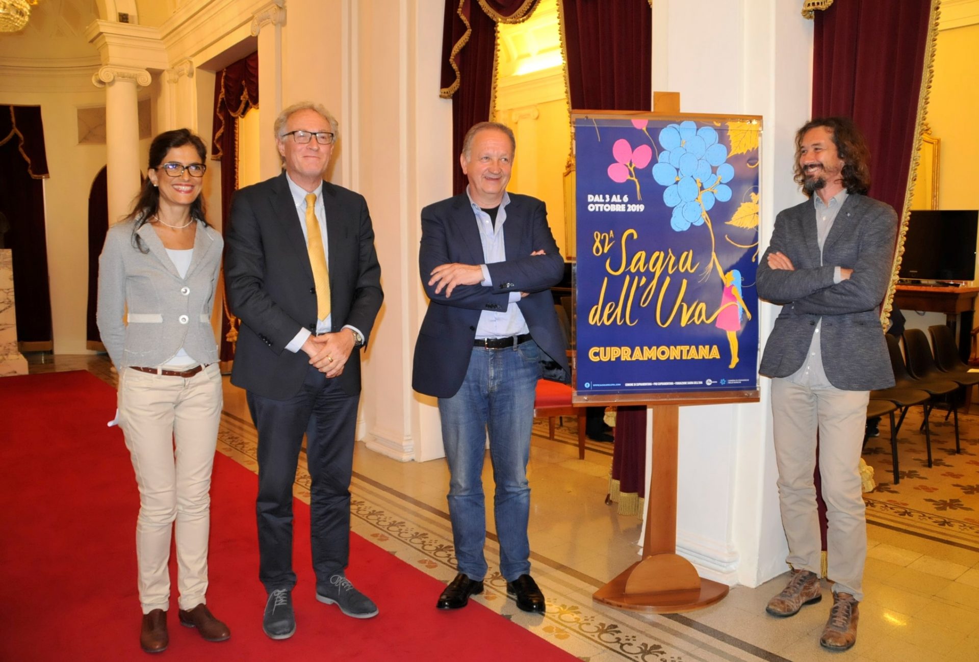 Nella foto Corrado Dottori, presidente Associazione di Vitivinicoltori cuprensi “La strada del gusto di Cupra Montana”, Luigi Cerioni, sindaco di Cupramontana e presidente della Fondazione Sagra dell’Uva di Cupramontana, Giancarlo Catani, presidente della Consulta del Turismo del Comune di Jesi, Lucia Chiatti, amministratore delegato della Fondazione Pergolesi Spontini