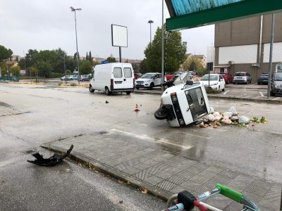 Un violento scontro tra un furgone Ducato e un Ape car si è verificato verso le 13 lungo via Gallodoro, proprio nel momento in cui impazzava il maltempo. Secondo una primissima ricostruzione della dinamica, su cui stanno lavorando gli agenti della Polizia locale di Jesi intervenuti per i rilievi di legge, alla base del sinistro vi sarebbe una mancata precedenza. Ma saranno poi gli agenti a stabilire le responsabilità. L’urto, violentissimo, avrebbe provocato il ribaltamento del mezzo a tre ruote, che era carico di cassette di verdura che si sono sparpagliate sull’asfalto. L’Ape è rimasto in bilico su un fianco, mentre il conducente (G.B., 70 anni di Jesi) è rimasto incastrato nell’abitacolo. Soccorso dai sanitari del 118, della Croce verde e dai Vigili del fuoco, l’uomo è stato trasferito in codice giallo – anche per la dinamica maggiore dell’incidente – al pronto soccorso dell’ospedale Carlo Urbani per gli accertamenti del caso. Era cosciente ma dolorante per le ferite riportate. Illeso il conducente del furgone Ducato (F.O.), 50 anni residente a Maiolati Spontini.