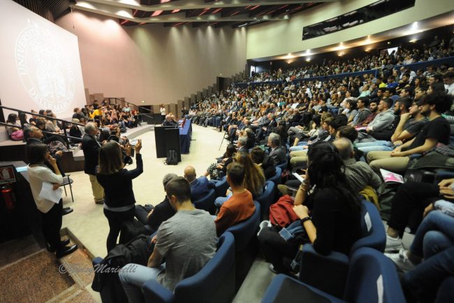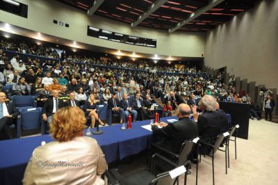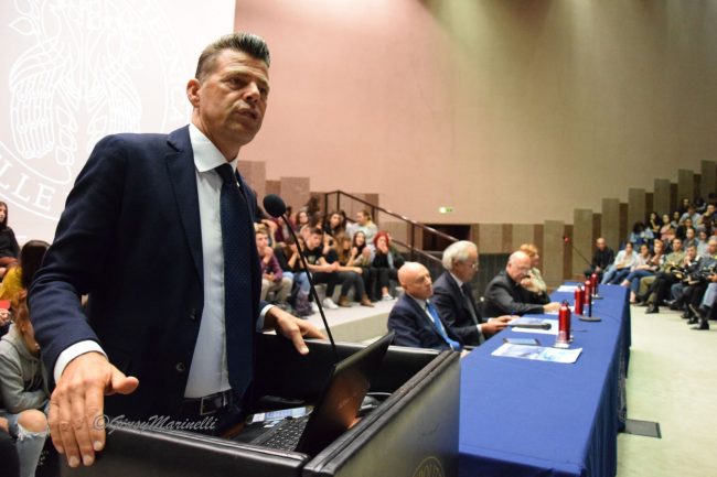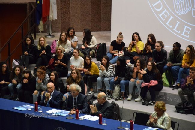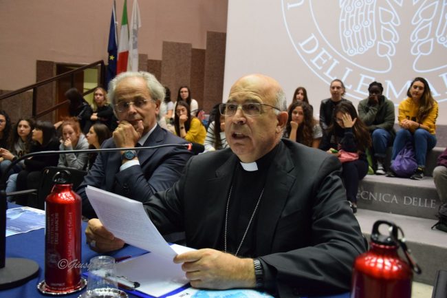 Straripante di studenti, stamattina, l’aula Magna dell’ateneo di Ancona, dove i relatori hanno fatto da un lato un’analisi spietata della situazione drammatica in cui versano i mari del pianeta – a causa di varie fonti di inquinamento, cambiamenti climatici, uso dissennato delle risorse, mancanza di adeguata tutela dell’ecosistema – e abbozzando alcune strategie possibili, imperative per invertire la rotta in direzione di una economia marittima eco-sostenibile. Per l’arcivescovo mons. Angelo Spina «l’acqua è sorella dell’uomo», come declamava il patrono d’Italia nel suo “Cantico delle creature”, che andrebbe fortemente attualizzato. Acqua come bene comune, di tutti, da custodire, appunto. E bisogna accelerare in questa azione di custodia e protezione perché entro 11 anni il processo di ammaloramento del mare potrebbe diventare irreversibile. Una sorta di miracolo laico, in questo senso, è possibile oltre che obbligato. Soprattutto se – grazie allo sviluppo della ricerca tecnologica e della sensibilizzazione di tutti a nuove pratiche dal “pollice blu” – saranno coinvolte le nuove generazioni, giovani e studenti, in particolare universitari. Un mezzo miracolo, del resto – ma bastava avere la felice idea – è stato il riuscitissimo esperimento attuato, primo e unico in Italia, dalla marineria di San Benedetto del Tronto, ricordato da Rodolfo Giampieri, presidente ad Ancona dell’Autorità di Sistema Portuale in Adriatico, e dall’ufficiale della Capitaneria di Porto di Ancona, Piccioni.