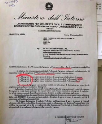 La circolare del ministero dell’Interno porta la data dello scorso 24 settembre e, dopo gli ultimi sbarchi, fissa in emergenza i dettagli del piano di accoglienza di migranti sul territorio nazionale disponendo la distribuzione per 90 di loro dal centro di Villa Sikania di Agrigento alle strutture di accoglienza delle province di Ancona, Terni, ed Avellino. Un destinazione che dovrà essere definita e filtrata dalle Prefetture di riferimento delle tre regioni I primi trenta immigrati stanno, quindi, per essere inviati nella provincia di Ancona. Sono alcune delle persone sbarcate negli ultimi giorni e che hanno messo sotto pressione il sistema di accoglienza di Agrigento. Un provvedimento che fa annunciare proteste al leader della Lega, Matteo Salvini perché se a settembre gli arrivi sono stati 2.500 migranti in Italia, nello stesso mese del 2018 la cifra si era fermata a 947.