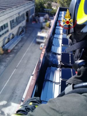 Una colonna di fumo nero si è alzata dal tetto di un capannone industriale in via Marconi, a Castelferretti. A notarla, questa mattina, è stato un dipendente della Vedetta2-Mondialpol che, libero dal servizio, transitava a bordo della sua auto sul cavalcavia di via delle Caserme. Accortosi dell’incendio, la guardia giurata – che era con la famiglia – ha subito lanciato l’allarme al 115 facendo scattare i soccorsi. Sul posto sono intervenuti tre automezzi dei vigili del fuoco del comando provinciale di Ancona e due dal distaccamento di Jesi, l’autoscala e il funzionario di servizio. Il capannone attualmente era in uso a una ditta americana subentrata in appalto ad Api. L’incendio si è sviluppato da un corto circuito ai pannelli fotovoltaici posti sopra il tetto danneggiandone alcuni, ma non si è propagato all’interno del fabbricato. In via precauzionale è stata anche evacuata una ditta di segnaletica stradale adiacente al capannone dove si trovavano a lavoro sei dipendenti che non si erano accorti di nulla. Un’altra azienda vicina, dove c’era solo una persona, è stata ugualmente evacuata precauzionalmente per via del fumo. Non si segnalano persone coinvolte. Sul posto è intervenuta anche una pattuglia dei carabinieri della Tenenza di Falconara.