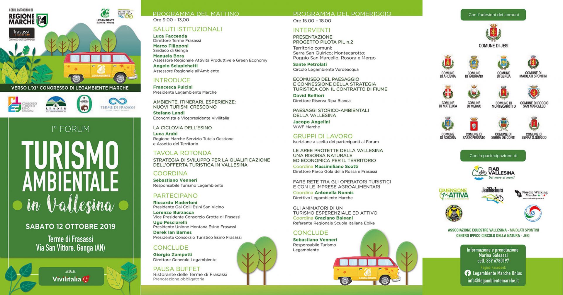 Il Forum rappresenta il primo di una serie di incontri territoriali pensati per approfondire questo tema, ma anche per parlare delle potenzialità della cultura del territorio della Vallesina, ancora poco percepita come vera e propria destinazione turistica. Parteciperanno all’evento: Manuela Bora, assessore regionale attività produttive e green economy; Angelo Sciapichetti, assessore regionale all’Ambiente; Marco Filipponi, sindaco di Genga; Giorgio Zampetti, direttore generale Legambiente; Sebastiano Venneri, responsabile turismo Legambiente; Francesca Pulcini, presidente di Legambiente Marche; Luca Faccenda, direttore Terme di Frasassi; Stefano Landi, economista e vicepresidente di Vivilitalia; Luca Arabi, servizio tutela gestione e assetto del territorio Regione Marche; Riccardo Maderloni, presidente GAL Colli Esini-San Vicino; Lorenzo Burzacca, presidente consorzio Grotte di Frasassi; Ugo Pesciarelli, presidente unione montana Esino Frasassi; Derek Ian Barnes, presidente consorzio turistico Esino Frasassi; Sante Petrolati, circolo Legambiente Verdeacqua; David Belfiori, direttore riserva Ripa Bianca; Jacopo Angelini, WWF Marche; Massimiliano Scotti, direttore Parco Gola della Rossa e di Frasassi; Antonella Nonnis, direttivo Legambiente Marche e Graziano Baleani, referente regionale scuola italiana Ebike.