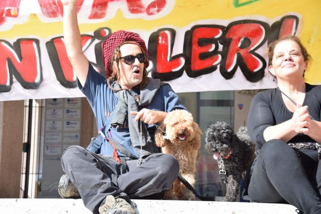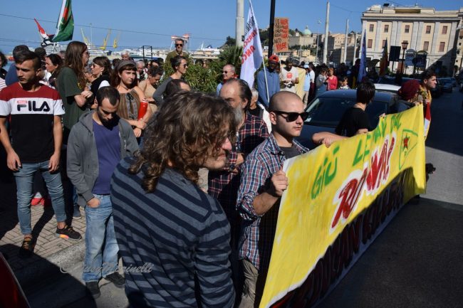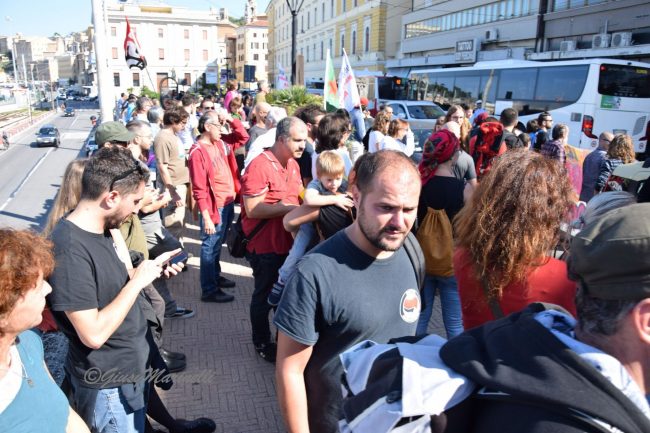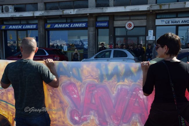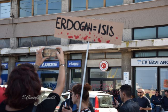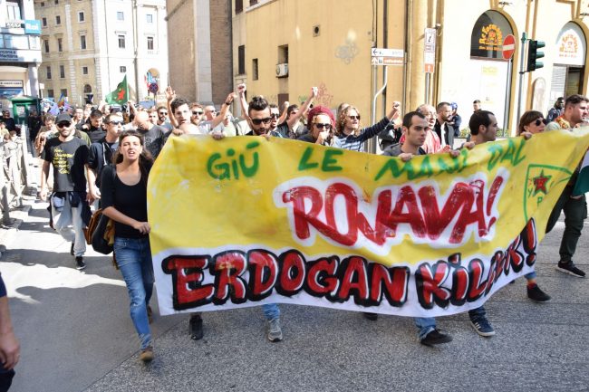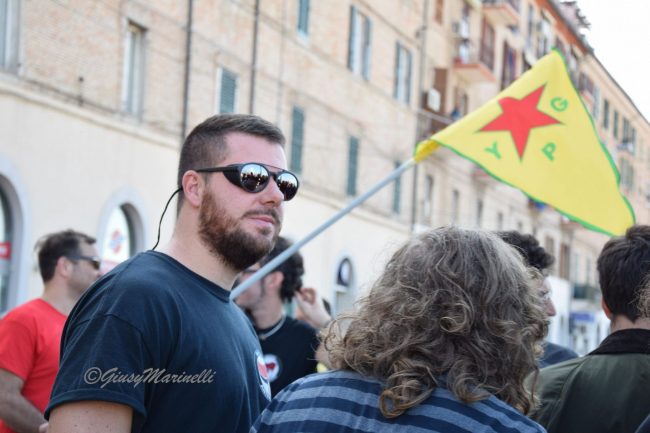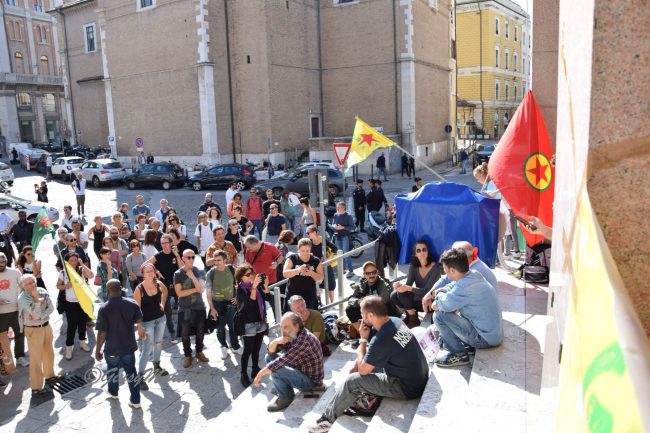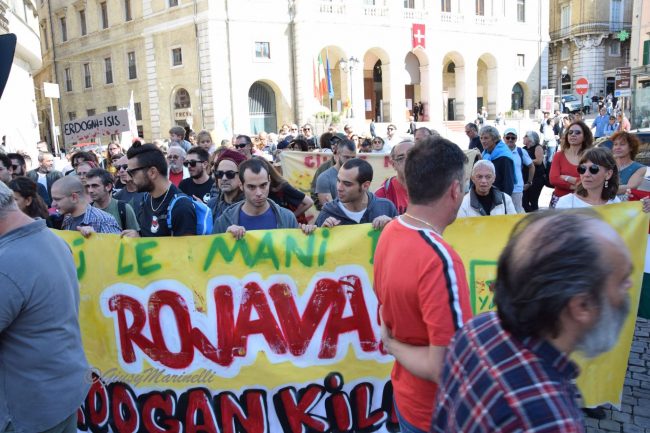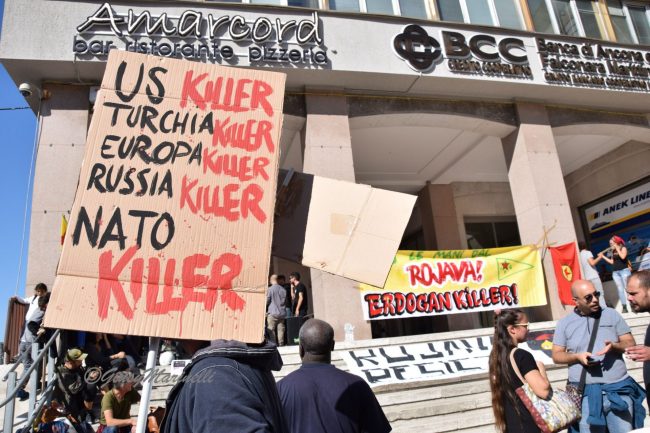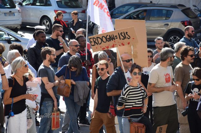 Si è conclusa pacificamente la prima delle due manifestazioni oggi in programma ad Ancona, coordinata dalla Ambasciata dei diritti Marche con la partecipazione dei militanti dei centri e laboratori sociali del capoluogo, di attivisti dei movimenti e di comuni cittadini, dalla provincia di Ancona e non solo. Oggi alle 18 si replica in piazza Roma, con il secondo presidio contro la guerra in Rojava, coordinato assieme ad altre sigle da Altra idea di città, che comunque ha partecipato alla manifestazione mattutina con qualche suo esponente. Sulla scalinata del palazzo della Rai regionale non ci sono stati simboli di partito, solo la bandiera dell’Ambasciata dei diritti Marche e poi i cartelli contro il presidente della Turchia. Fra i presenti, anche Andrea Nobili, Garante regionale dei diritti delle persona che questi giorni ha annunciato di aver annullato la sua visita a Istanbul ad una conferenza sui diritti dell’uomo, in segno di protesta contro l’aggressione turca. Il primo dei due sit-in previsti in giornata ad Ancona è stato scandito dagli interventi al microfono degli attivisti, che hanno ricordato il ruolo essenziale nel processo verso la stabilizzazione di quella tormentata area ricoperto dalla Federazione democratica della Siria del Nord. Il Rojava, Stato auto proclamato a maggioranza curda e abitato anche da assiri, turkmeni, yazidi, arabi – hanno sottolineato i manifestanti – ha dato luogo a un governo basato sulla parità di genere, l’ecologia, la partecipazione assembleare e oggi è aggredito nell’immobilismo delle istituzioni europee. La mattinata è proseguita poi fra musica, cori, volantini, lo sventolare di drappi del Ypg e del Ypj, le unità di protezione popolare, la prima maschile, la seconda composta da donne, che hanno combattuto nel nord della Sira contro l’avanzata dell’Isis, liberando le proprie città sotto assedio e poi versando un contributo essenziale alla respinta delle truppe nere del Daesh. Sulla porta a vetri del palazzo di via XXIX Settembre dove ha sede il Consolato di Turchia è stata tracciata anche la scritta “Erdogan Assassino” in vernice spray viola, lasciata già prima che il corteo giungesse a destinazione, accompagnato dalle forze dell’ordine e dagli agenti della Digos.