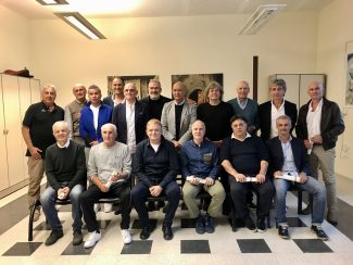 Reunion delle vecchie glorie della storia calcistica fabrianese. Gli ex giocatori si sono ritrovati ieri allo stadio ‘Aghetoni, teatro dei fasti del Fabriano Calcio che militava con successo in quella che era la sesta serie italiana. Sono stati ricevuti nella Sala Giunta del Comune di Fabriano dall’Assessore allo sport Francesco Scaloni che ha omaggiato ogni calciatore di una filigrana con carta di Fabriano. In serata tutti i partecipanti si sono ritrovati al “Cavallo pazzo”. Hanno partecipato i giocatori degli anni ’79, ’80 e ’81.