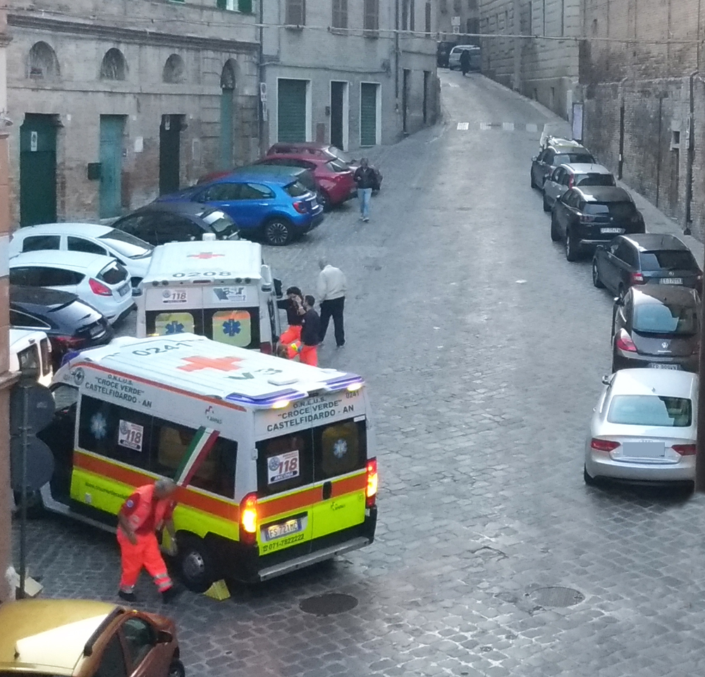 Osimo, i mezzi del 118 mentre domenica scorsa soccorrevano il 36enne lauretano in evidente stato di alterazione psicofisica in via Matteotti
