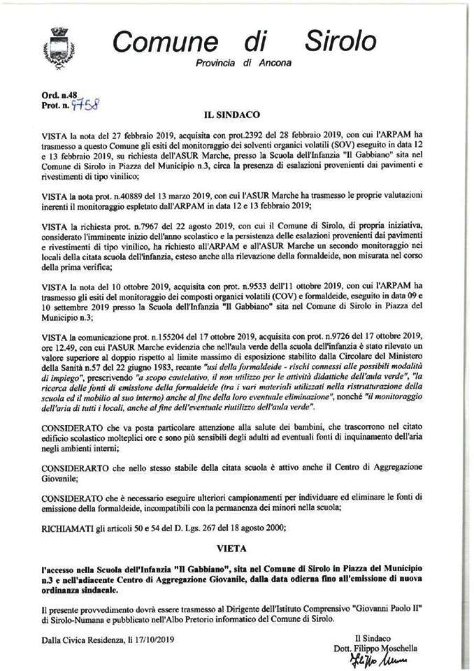 Formaldeide sul pavimento dell’asilo inaugurato appena un anno fa. All’arrivo dei referti di Arpam e Asur Marche, il sindaco di Sirolo, Filippo Moschella ieri, 17 ottobre, ha firmato un’ordinanza per disporre la chiusura della scuola dell’infanzia ‘Il Gabbiano’, ma anche l’adiacente centro di aggregazione giovanile. L’atto è stato inviato anche alla dirigente dell’I.c. ‘Giovanni Paolo II di Sirolo-Numana’. Gli sviluppi sono arrivati dopo le proteste per le esalazioni provenienti dai pavimenti e rivestimenti di tipo vinilico, mosse dei genitori dei 50 alunni che frequentano le aule della scuola materna inaugurata a settembre 2018.