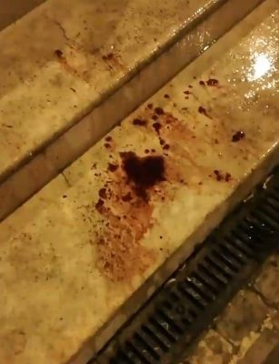 Il sangue rimasto sulla scalinata della fontana della Pupa, a Osimo, dopo l’aggressione, avvenuta nelle prime ore di sabato