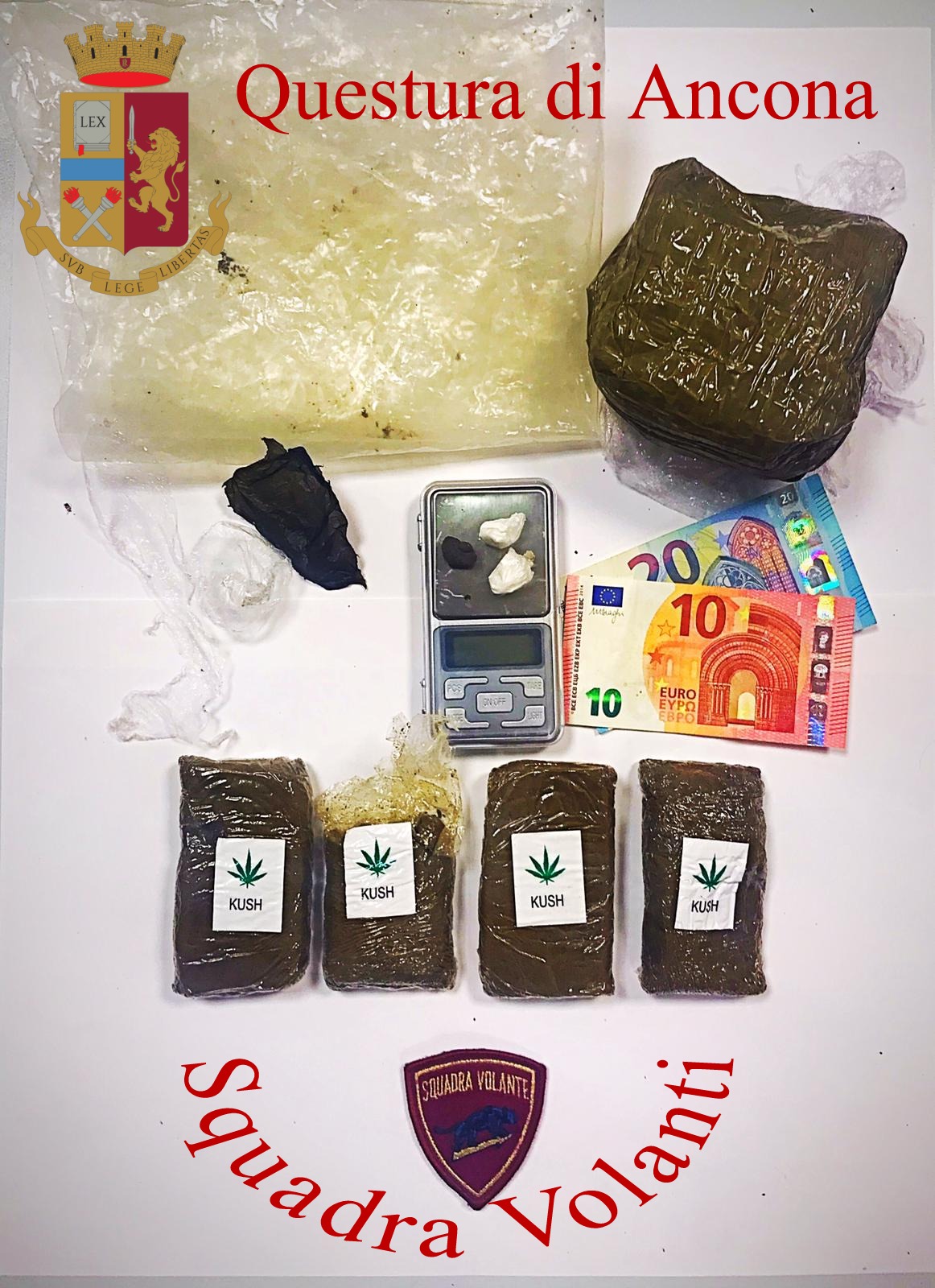 A distanza di alcuni mesi il giovane si era rimesso a spacciare droghe di pregiata qualità più la cocaina soprattutto nei fine settimana nella zona di Brecce Bianche. E così, verso le 18 di ieri, gli agenti delle Volanti della Questura di Ancona, diretti dal S. Commissario Franco Pechini, lo hanno intercettato in Via Caduti del Lavoro mentre, a bordo del suo ciclomotore, si muoveva per una consegna di sostanze stupefacenti. Infatti, il giovane, rispetto al passato, aveva cambiato strategia; non più lo spaccio in garage come avveniva qualche mese prima, ma si muoveva come un pony express. Subito perquisito, i poliziotti trovavano in una tasca del giubbetto, un panetto di circa 100 grammi kush, droga particolarmente diffusa ad Ancona che contiene una sostanza estremamente potente, con un livello di THC in percentuale molto più elevato rispetto all’hashish normale, alcune banconote da 10 euro riposte alla rinfusa ed un telefono cellulare utilizzato per gli appuntamenti, rigorosamente sui social.